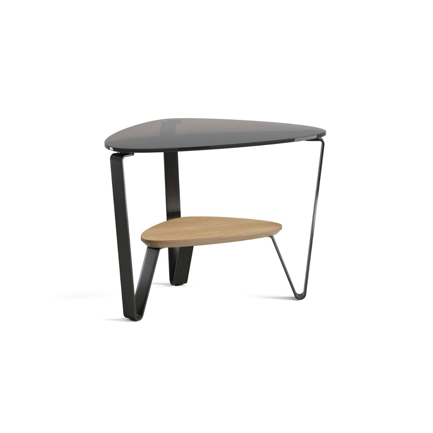 Designed by Louis A. Lara, the Dino End Table has a soft, triangular shape that makes it versatile for a range of settings, from living rooms, to office spaces, to hallways, and more. Dino features a polished, grey-tinted tempered glass top and a beveled lower shelf made of hardwood with a washed oak veneer. Three brushed carbon legs with a black finish provide stable support for this sleek and modern end table.