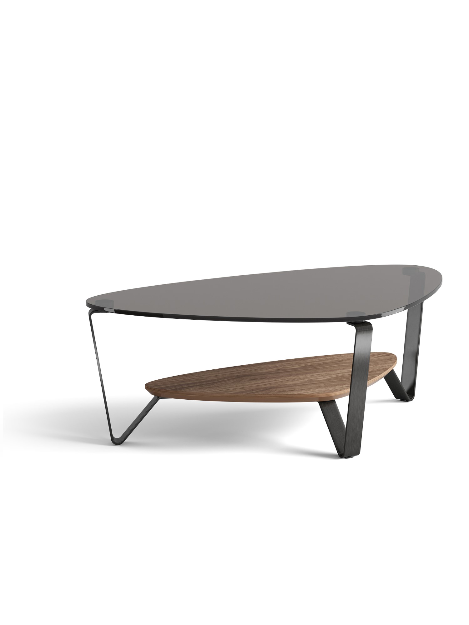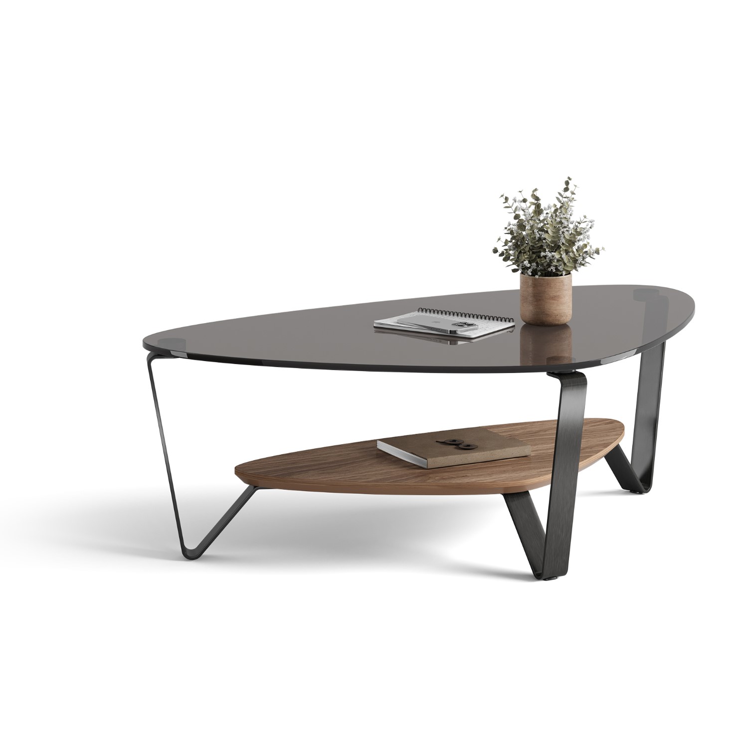 Designed by Louis A. Lara, the Dino Small Coffee Table has a soft, triangular shape that makes it versatile for a range of settings -- and ideal paired with a sectional sofa. Dino features a polished, grey-tinted tempered glass top and a beveled lower shelf made of hardwood with a natural walnut veneer. Three brushed carbon legs with a black finish provide stable support for this small yet mighty coffee table.