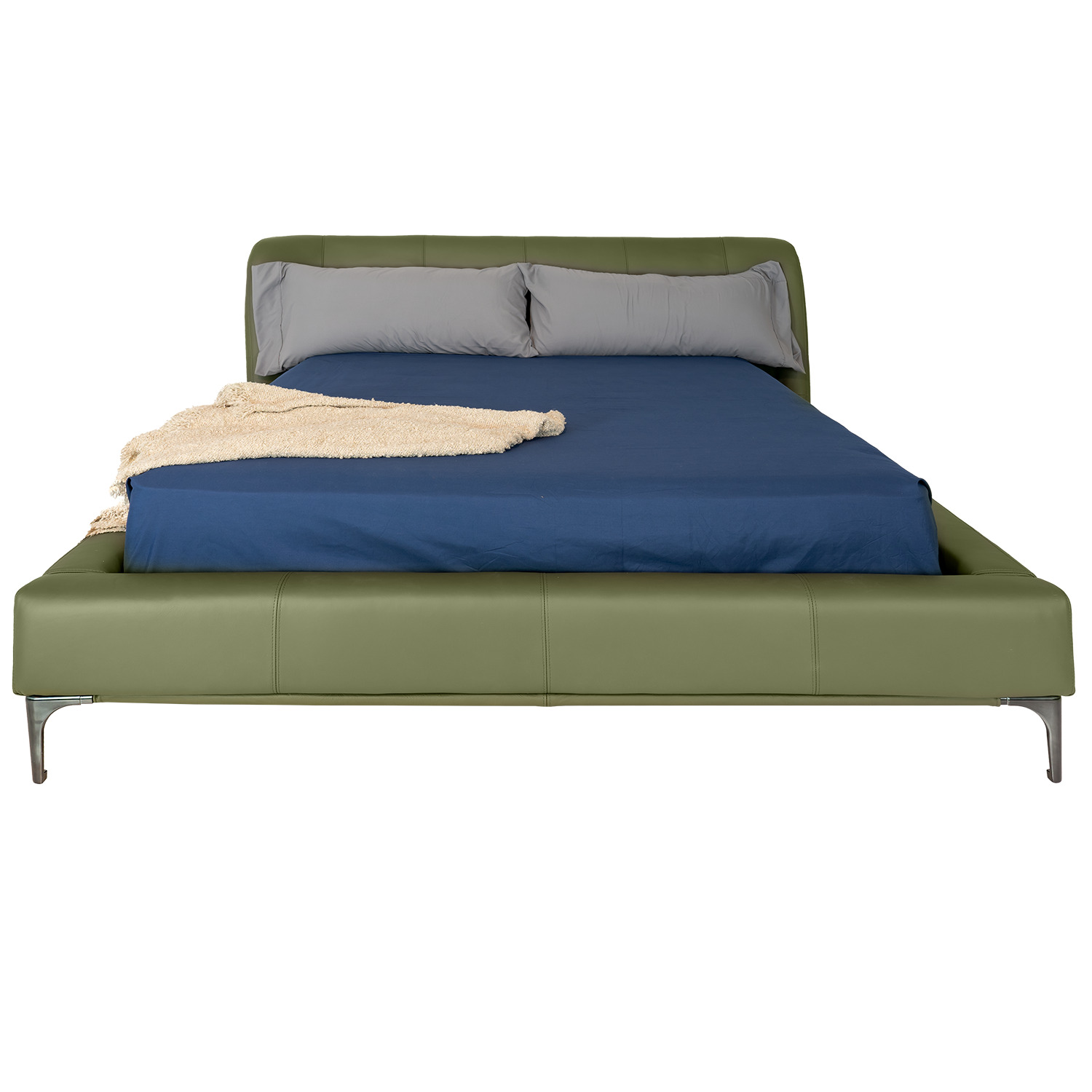 Savor the luxurious comfort of the Dionne King Bed, upholstered in an earthy olive green protected leather. Dionne's lower frame is supported by dark grey metal legs and features accent stitching that matches the padded headboard, creating a continuous, tailored look. Reaching to the ground, the headboard gently curves at each end in a subtle cradle that will surround you with comfort.