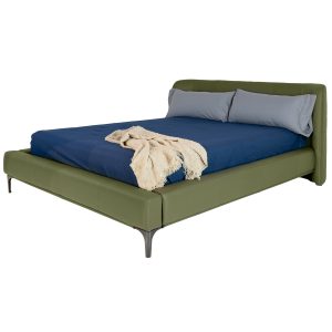 [0] => Savor the luxurious comfort of the Dionne Queen Bed, upholstered in an earthy olive green protected leather. Dionne's lower frame is supported by dark grey metal legs and features accent stitching that matches the padded headboard, creating a continuous, tailored look. Reaching to the ground, the headboard gently curves at each end in a subtle cradle that will surround you with comfort.