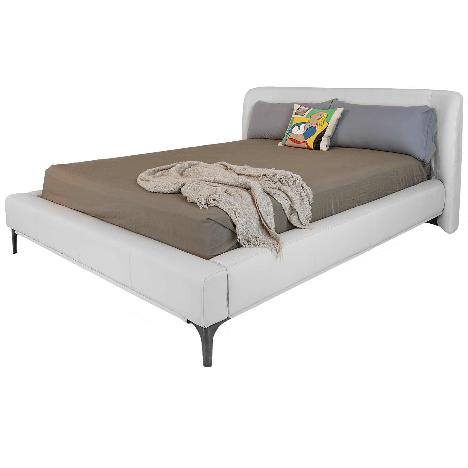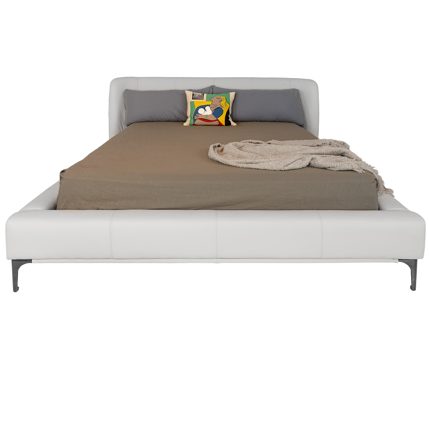 Savor the luxurious comfort of the Dionne Queen Bed, upholstered in a light grey protected leather. Dionne's lower frame is supported by dark grey metal legs and features accent stitching that matches the padded headboard, creating a continuous, tailored look. Reaching to the ground, the headboard gently curves at each end in a subtle cradle that will surround you with comfort.