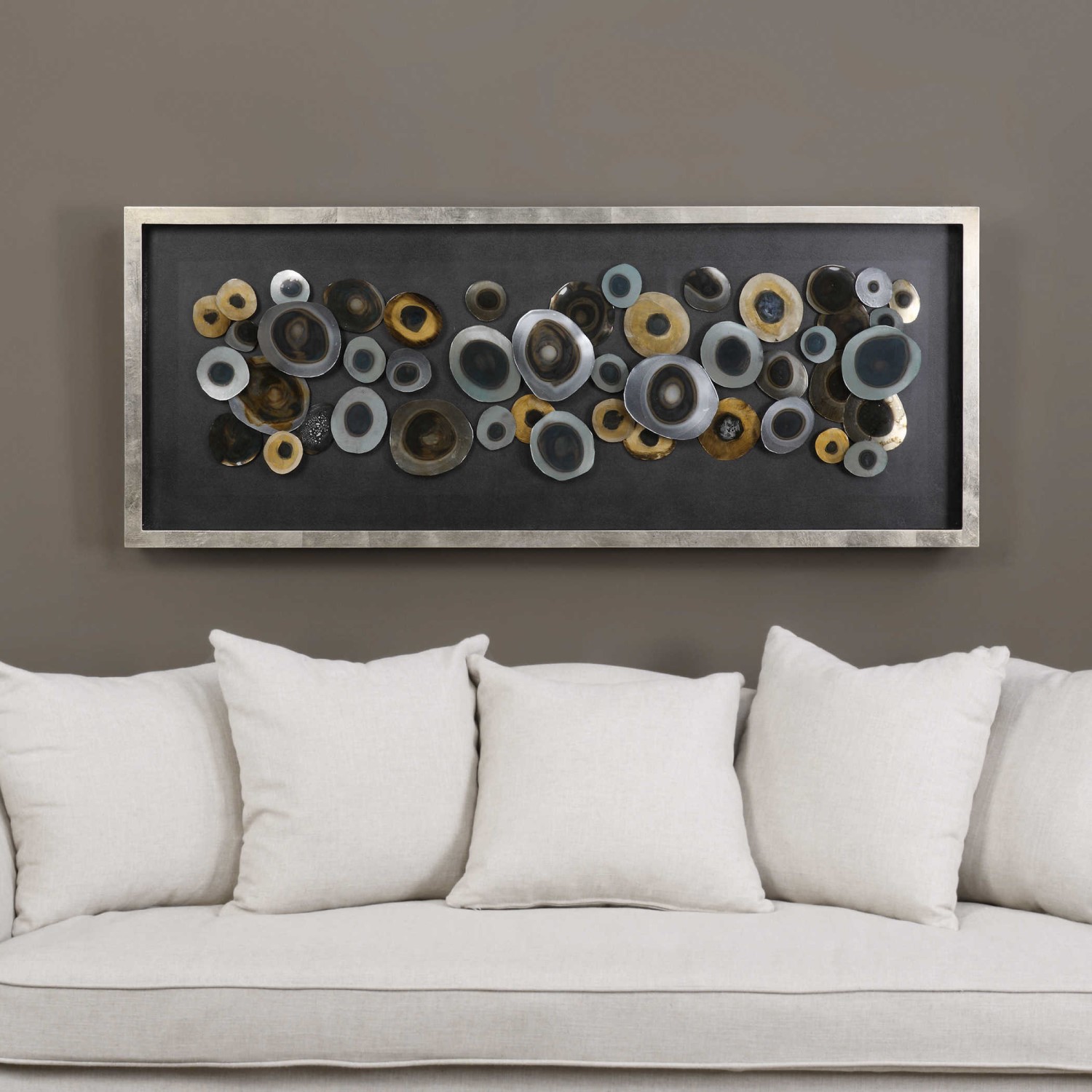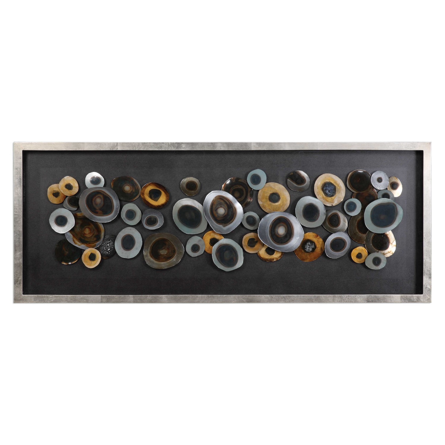 The Discs Shadow Box has an organic yet contemporary feel, with overlapping, blow-torched iron discs that feature hand-painted acrylic accents in earthy tones of brown, gold, and green. Discs' lightly antiquated silver leaf frame can be hung horizontally or vertically.