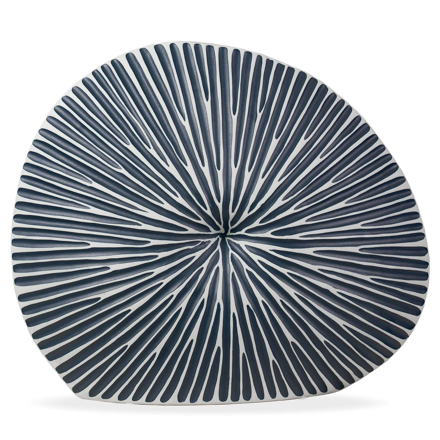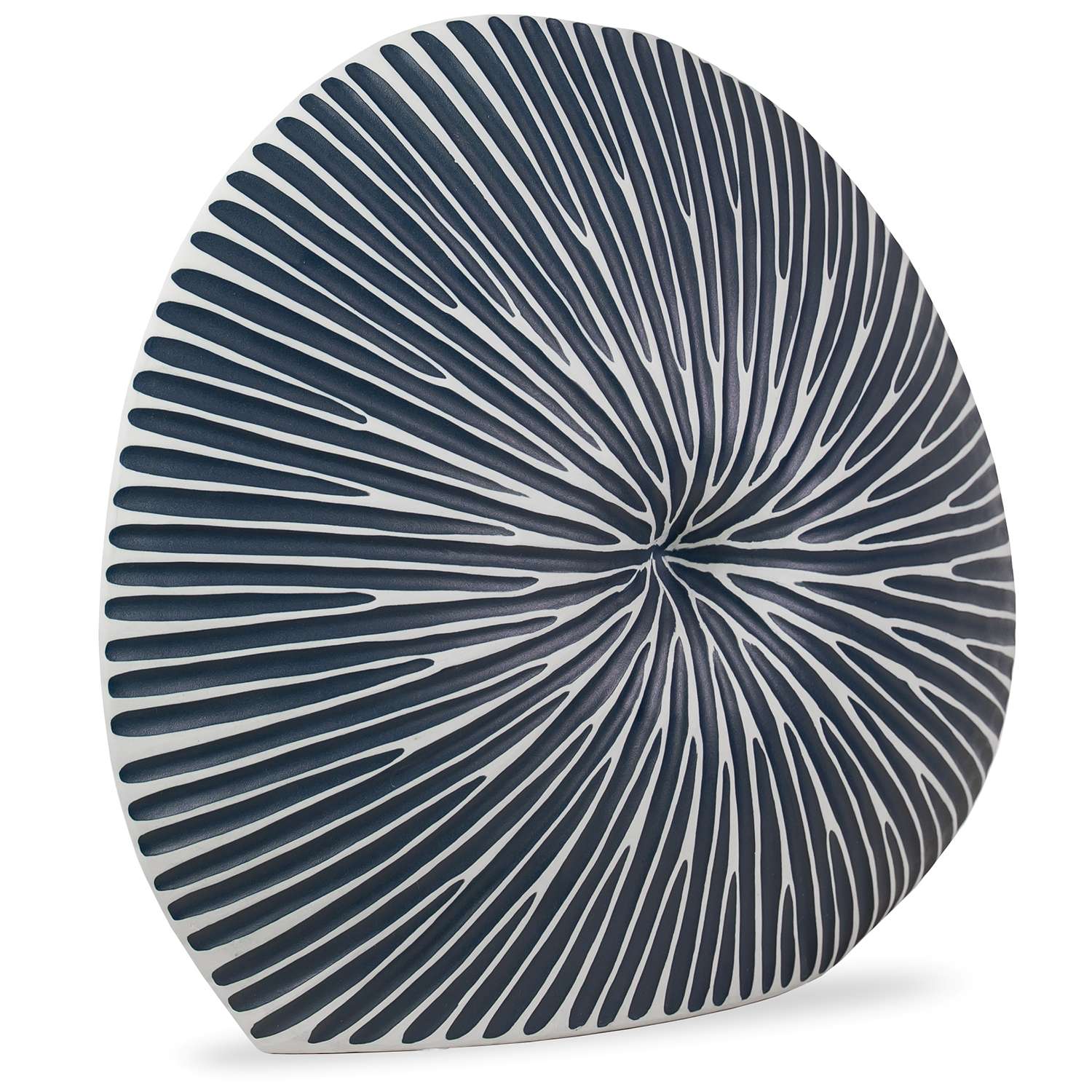 The Diva Vase is handcrafted from off-white porcelain with a marine-inspired pattern of dark blue radial stripes. Diva's round, flat, and slightly asymmetrical form is further enhanced by a ridged texture and a divot in its center, evoking the look of a sea creature. Show off a tasteful bouquet in this watertight vase or display it on its own to add a beachy, artistic vibe to any room.