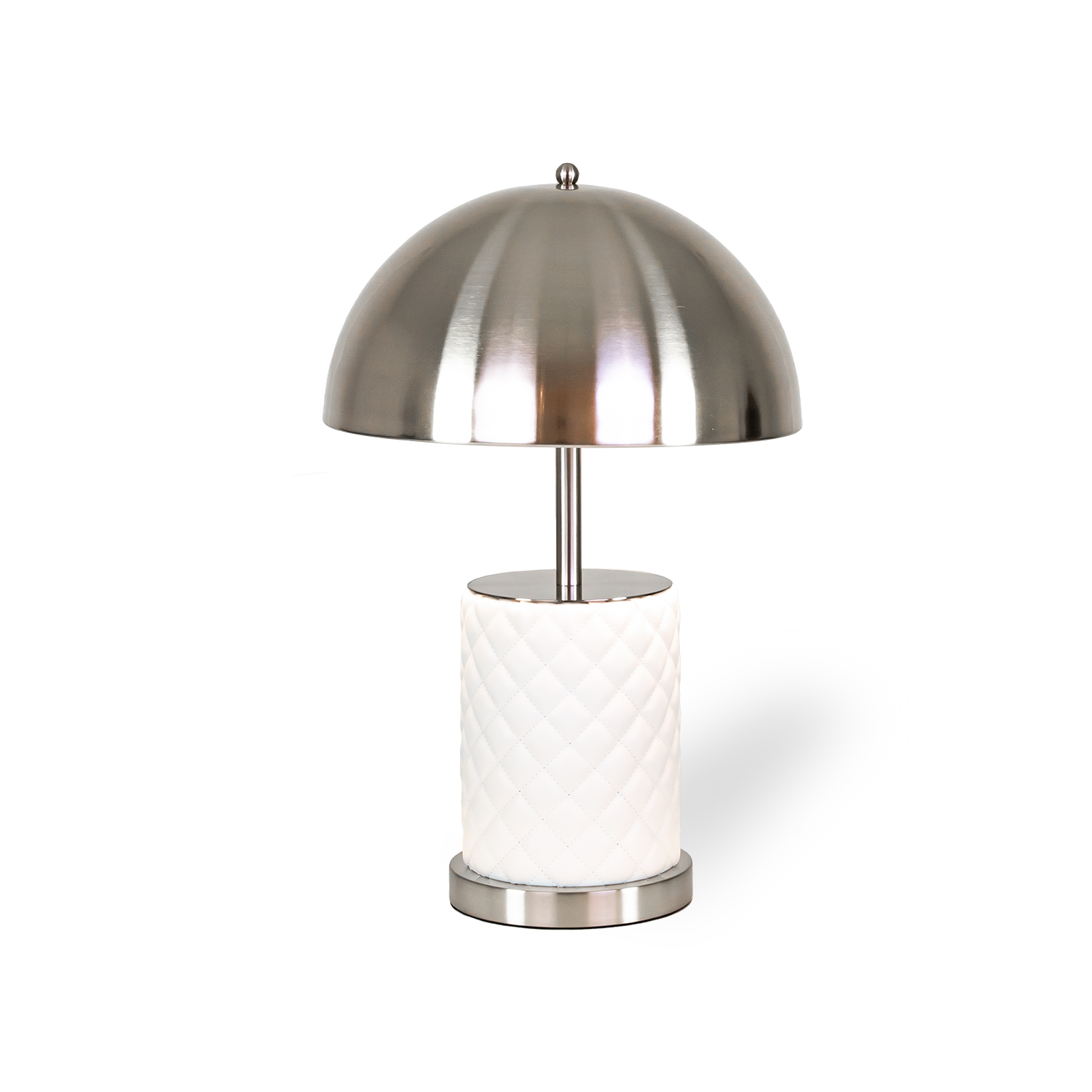 [0] => The Dome Table Lamp has a contemporary look, with a domed shade in satin nickel, and a base wrapped in white artificial leather. Matching quilted stitching on the base gives the lamp a clean look and adds texture. The Dome Table Lamp has an on/off cord switch and requires two E26 LED lightbulbs, not included.