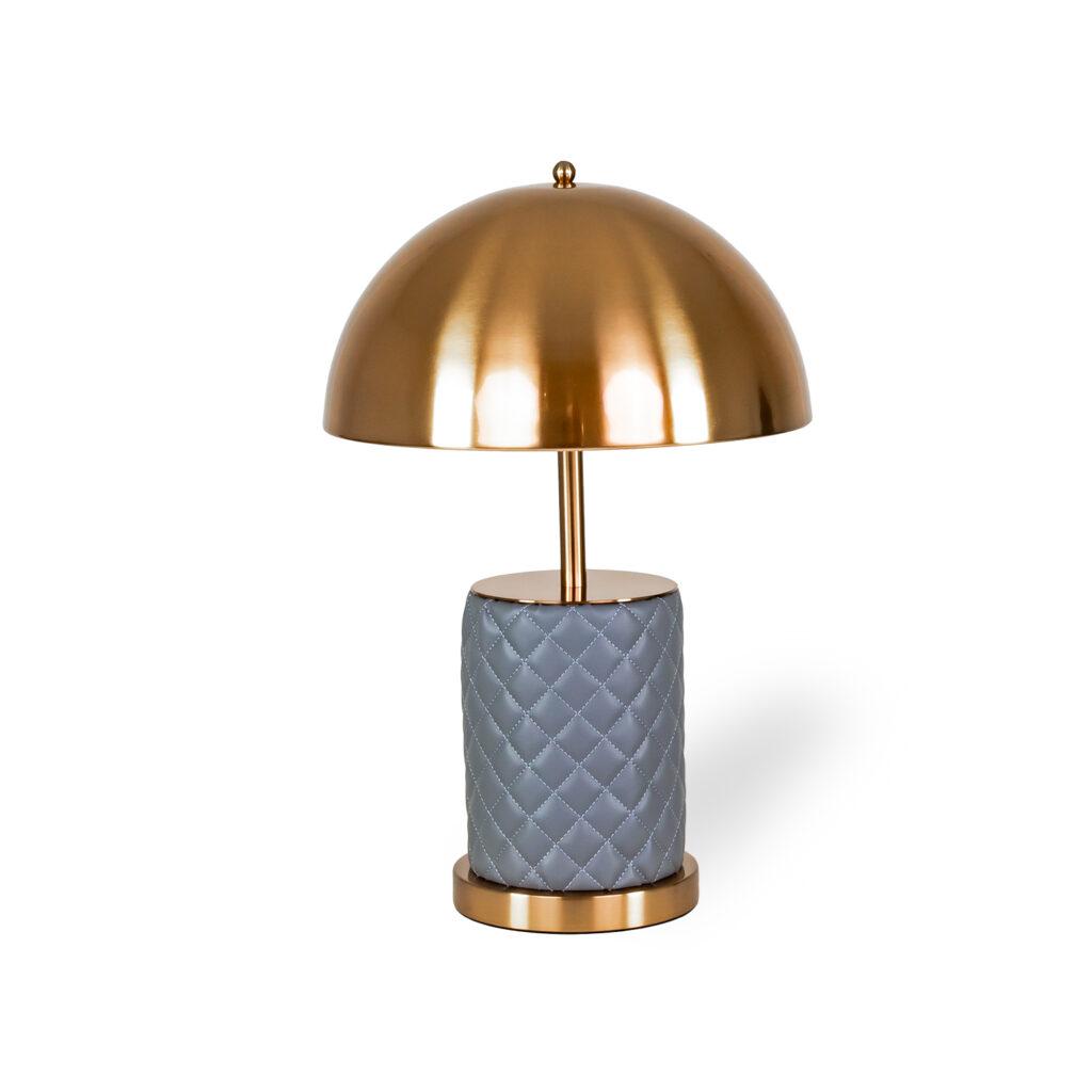 [0] => The Dome Table Lamp has a contemporary look, with a domed shade in brass, and a base wrapped in grey artificial leather. Matching quilted stitching on the base gives the lamp a clean look and adds texture. The Dome Table Lamp has an on/off cord switch and requires two E26 LED lightbulbs, not included.