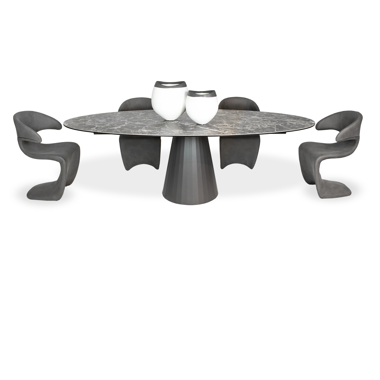 [0] => Create a stunning statement with the Dorico Oval Dining Table, designed in Italy by Elvis Tafaruci and crafted from steel and ceramic. Dorico's tabletop is fashioned from ceramic with a glass underside, and has a unique earth-toned "emperador" coloring that gives off a subtle shimmer. The beveled conical base, made of painted anthracite-colored steel, reflects gradations of light and shadow for a unique dining experience.