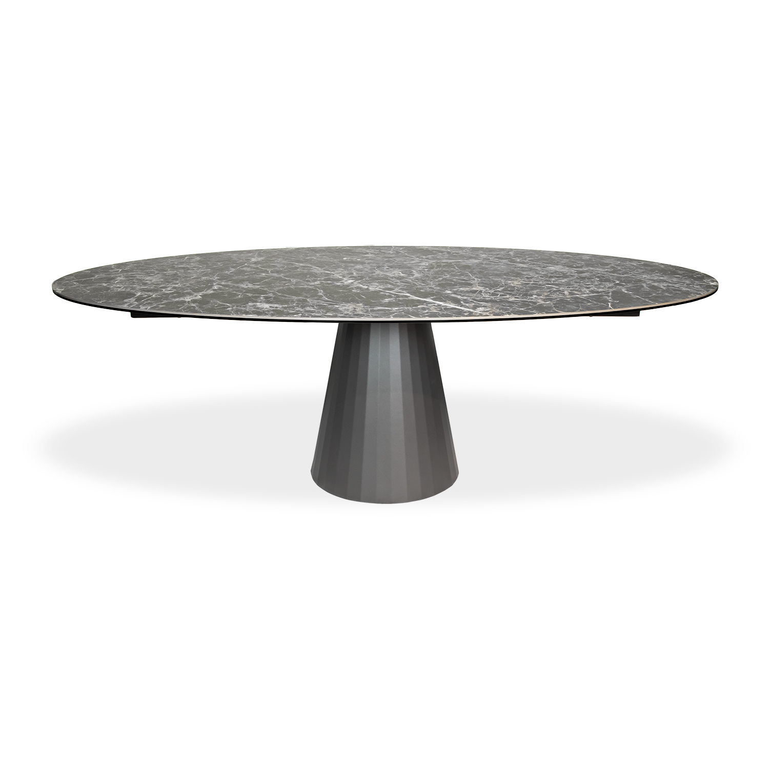 Create a stunning statement with the Dorico Oval Dining Table, designed in Italy by Elvis Tafaruci and crafted from steel and ceramic. Dorico's tabletop is fashioned from ceramic with a glass underside, and has a unique earth-toned "emperador" coloring that gives off a subtle shimmer. The beveled conical base, made of painted anthracite-colored steel, reflects gradations of light and shadow for a unique dining experience.
