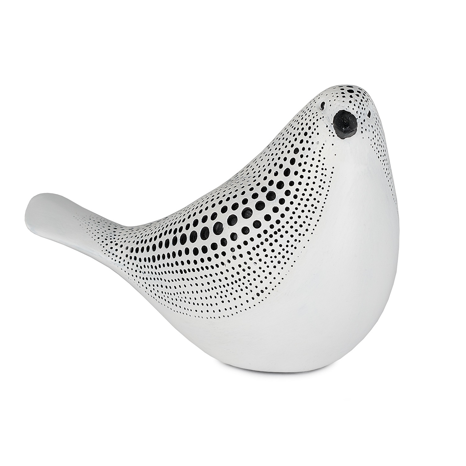 [0] => The Dotted Sitting Bird, shown in white, is a charming figure crafted from resin and embellished with a unique painted and debossed dot pattern in black. A rotund form and slightly cocked head give this bird a sense of lovable whimsy. Place this figurine on its own or with other accessories to add a touch of nature to your sideboard, bookshelf, or desk.
