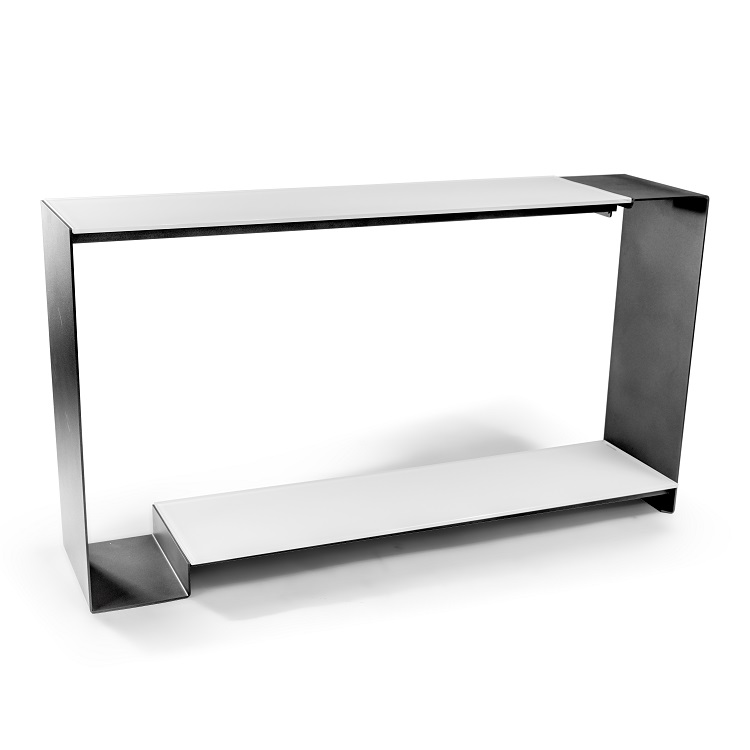 [0] => The Duo console table is a monochromatic, minimalist console table with a unique and precise design - the table has an angular anthracite metal frame and white niege etched glass tops. Duo offers streamlined style and stark contrasts.