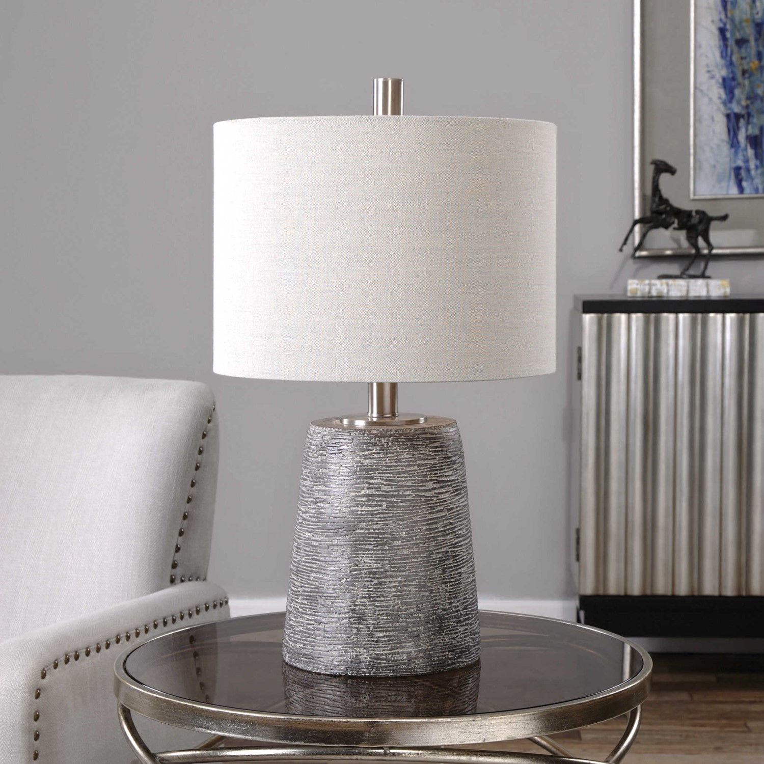 [0] => The Duron Table Lamp features a cylindrical base in a dark bronze ceramic that has beautiful, rustic-like texturing, and a light grey wash. The round, hardback drum shade is made from beige linen fabric that is accented by brushed nickel-plated details. Whether placed on a nightstand, end table, or shelf, Duron brings warm light and classic style to liven up any space.