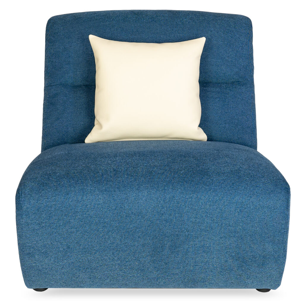 [0] => The Dutton Armless Chair features a plush, modern look optimized for comfort with its soft lines and blue Belfast fabric upholstery. Woven from a blend of polyester and acrylic, Belfast fabric is built to resist water- and oil-based stains, as well as everyday wear and tear, so you can relax with peace of mind. Featuring a wide, cushioned seat that extends to the ground and an angled backrest with horizontal stitching, this ample and cozy chair invites you to lean back and unwind. Use the Dutton chair on its own or mix and match with other pieces in the Dutton collection to form a customized, modular sectional.