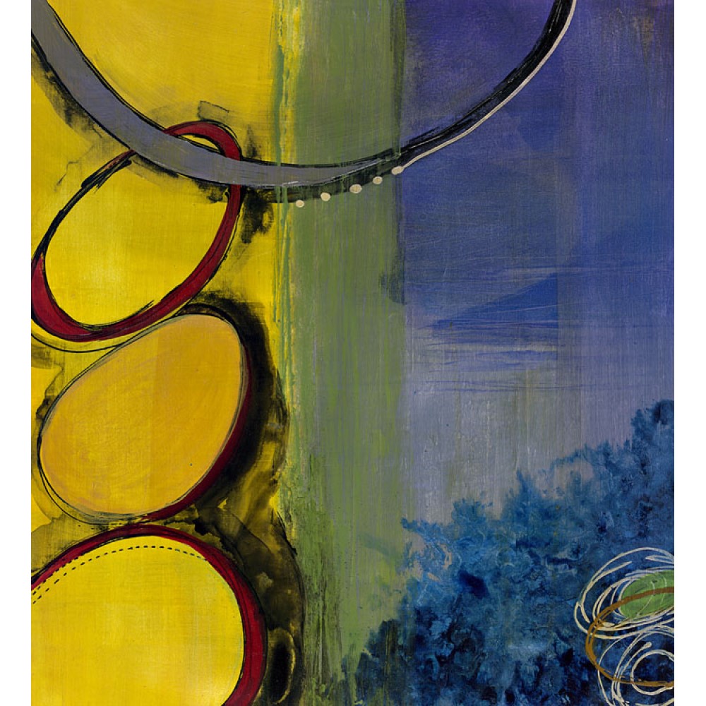 [0] => The Dynamic Motion V painting features rich primary colors that form an abstract, contemporary work of art. Yellow and blue meet in the middle to create green, while a repeating circle motif adds overlapping shapes in red, black, white, and grey. Dynamic Motion V will bring vibrant color and shape to your living or office space.