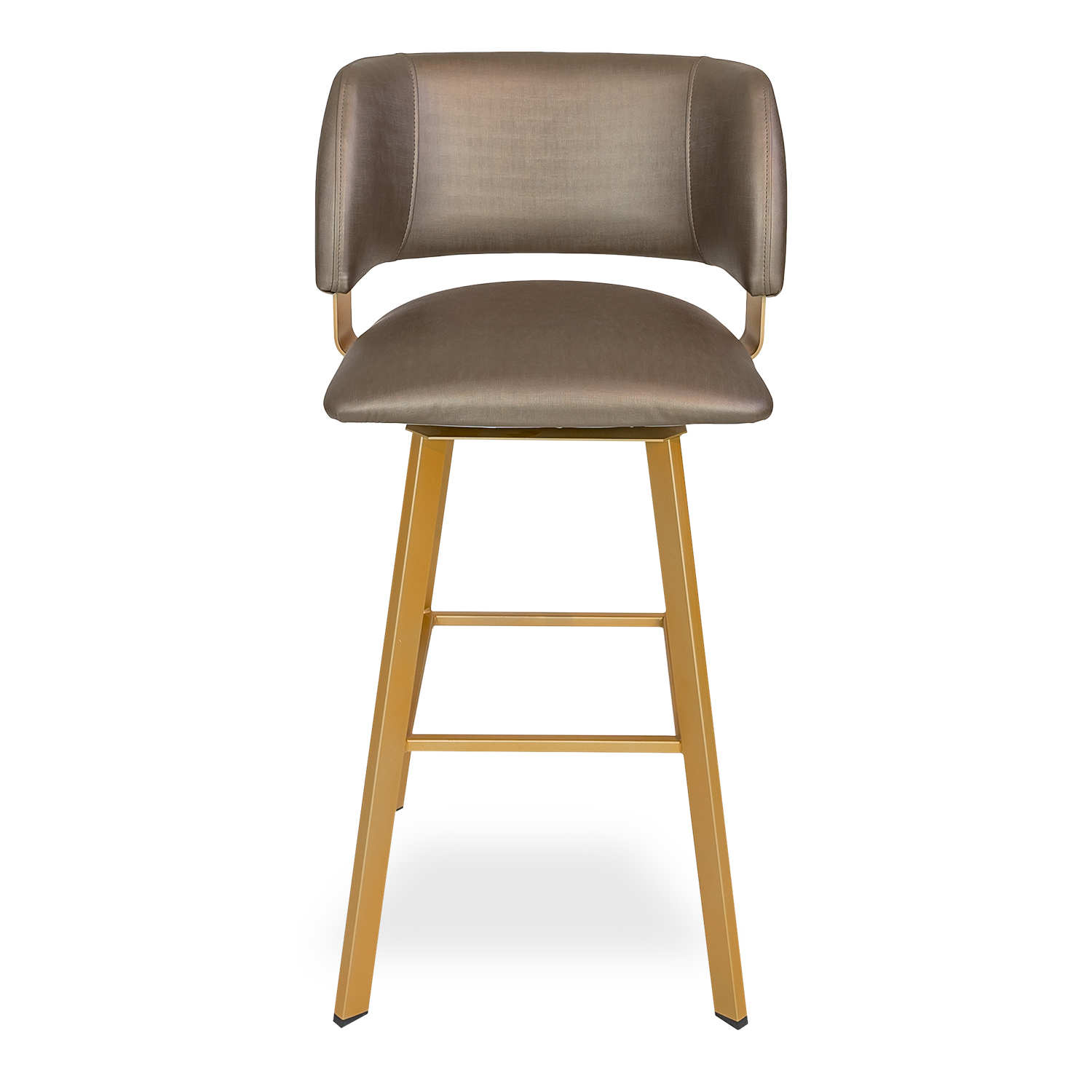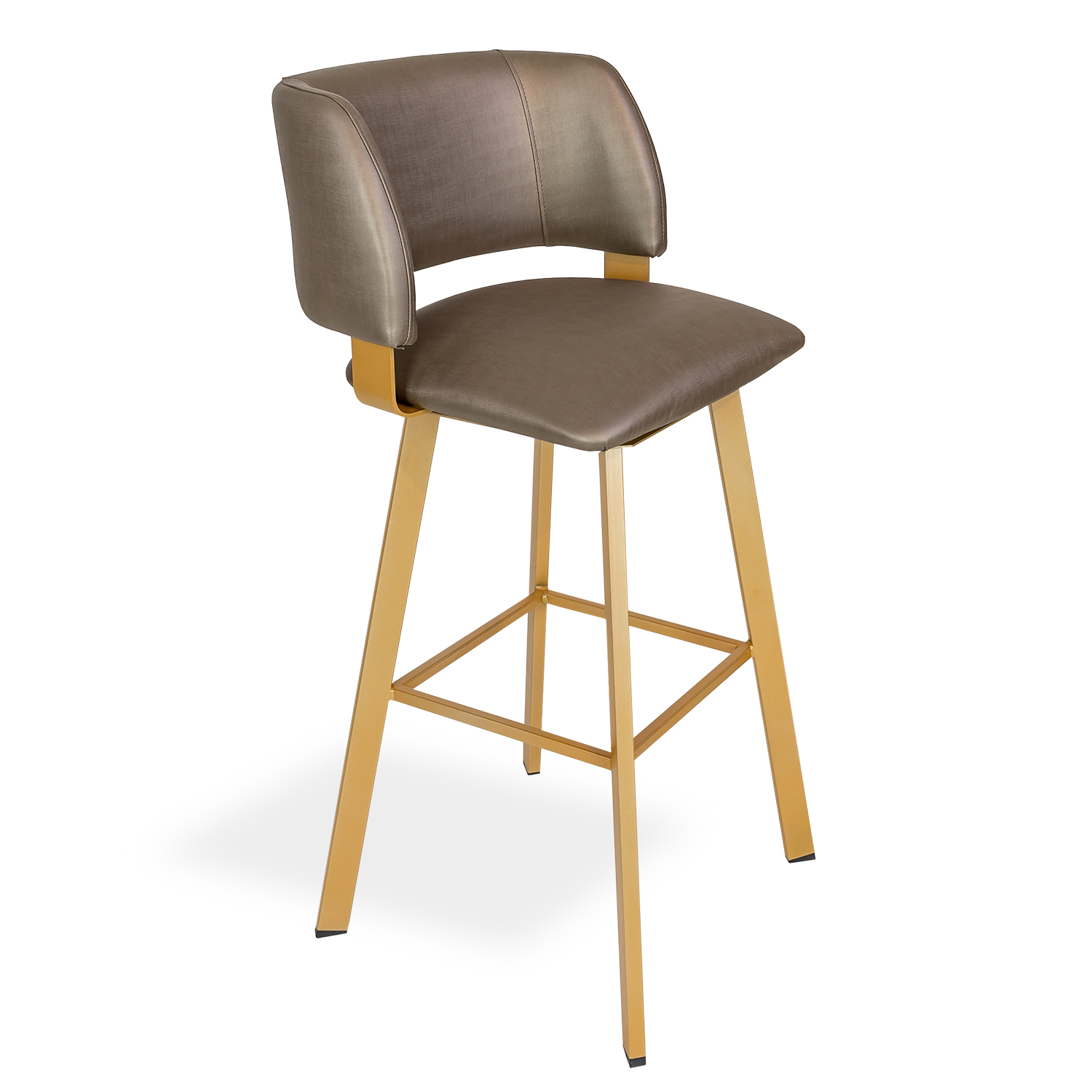 [0] => The Easton Barstool features a sungold metal base with a satin finish, and bronze shimmer artificial leather. The cushioned, wide seat is paired with a curved, wraparound back for your comfort. The straight lines and sharp angles of the minimalist base contrast with the rounded lines of the seat and back for a sophisticated, streamlined look.