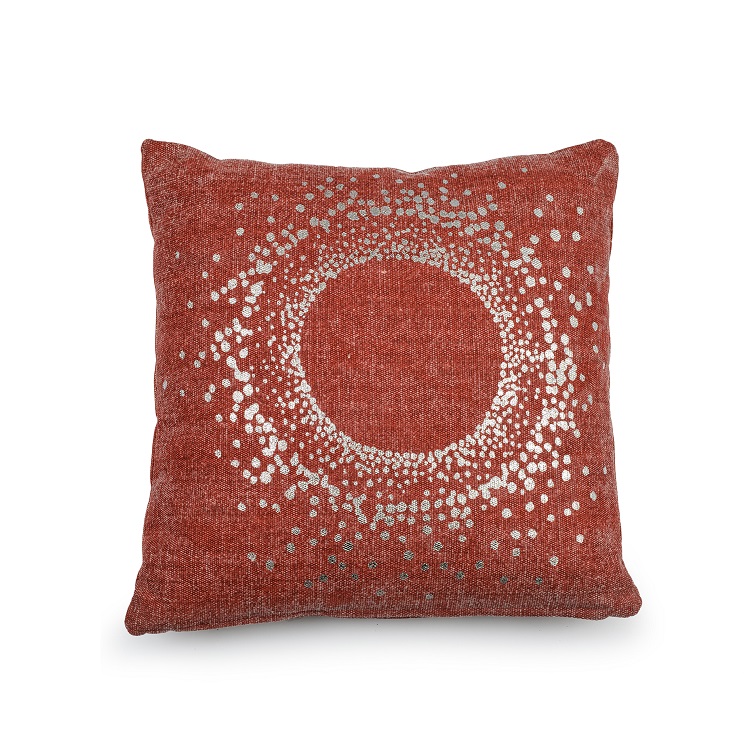 The Eclipse Pillow is made from 100% cotton with polyester filling and features a metallic silver circular pattern on a textured red background. Eclipse makes it easy to add a stylish flair to any living space.