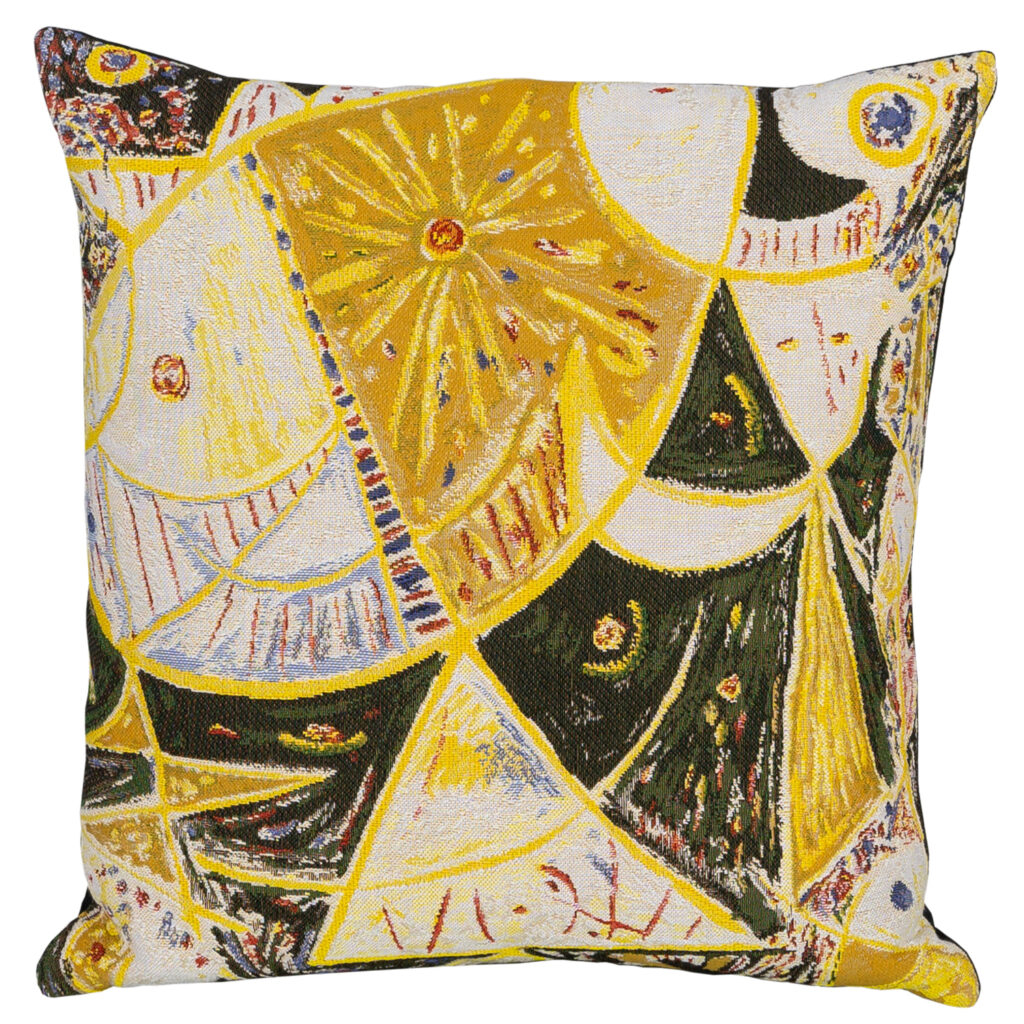 [0] => Featuring the art of Danish painter Egill Jacobsen, the Fantasy in Brown (1982) Pillow boldly uses geometric shapes and bright colors to depict the semi-abstract form of a grinning figure. Rich shades of yellow are complemented by red and blue accents and contrasted by a background in black and dark green. This pillow's jacquard-style front has a thick and durable feel and is woven from a cotton-poly blend with a discreet bottom zipper. Made in France, the Fantasy in Brown Pillow is a sophisticated and cheerful accent for any art lover's interior.