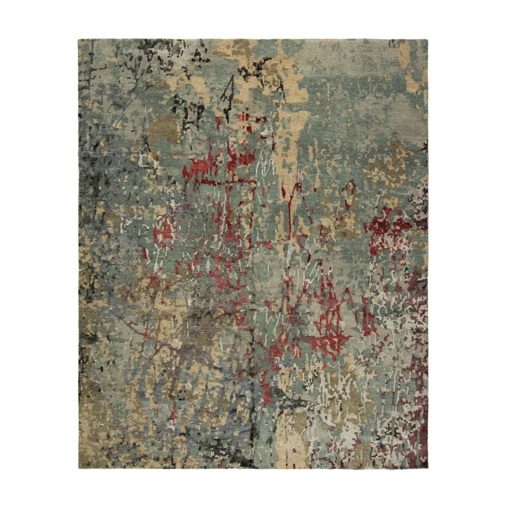 [0] => The Elegia rug is contemporary with variegated tones of red, grey, and blue. Elegia is knotted by hand in a Tibetan knot weave with with wool and Silkette, silk-like viscose yarns, against a natural cotton backing.