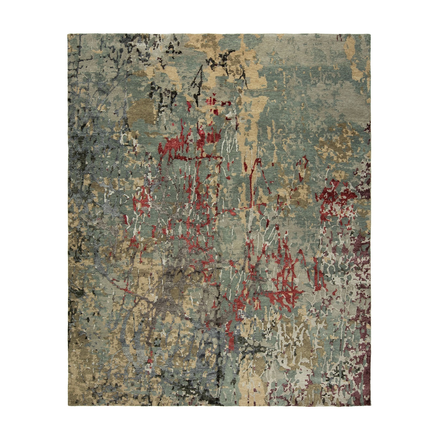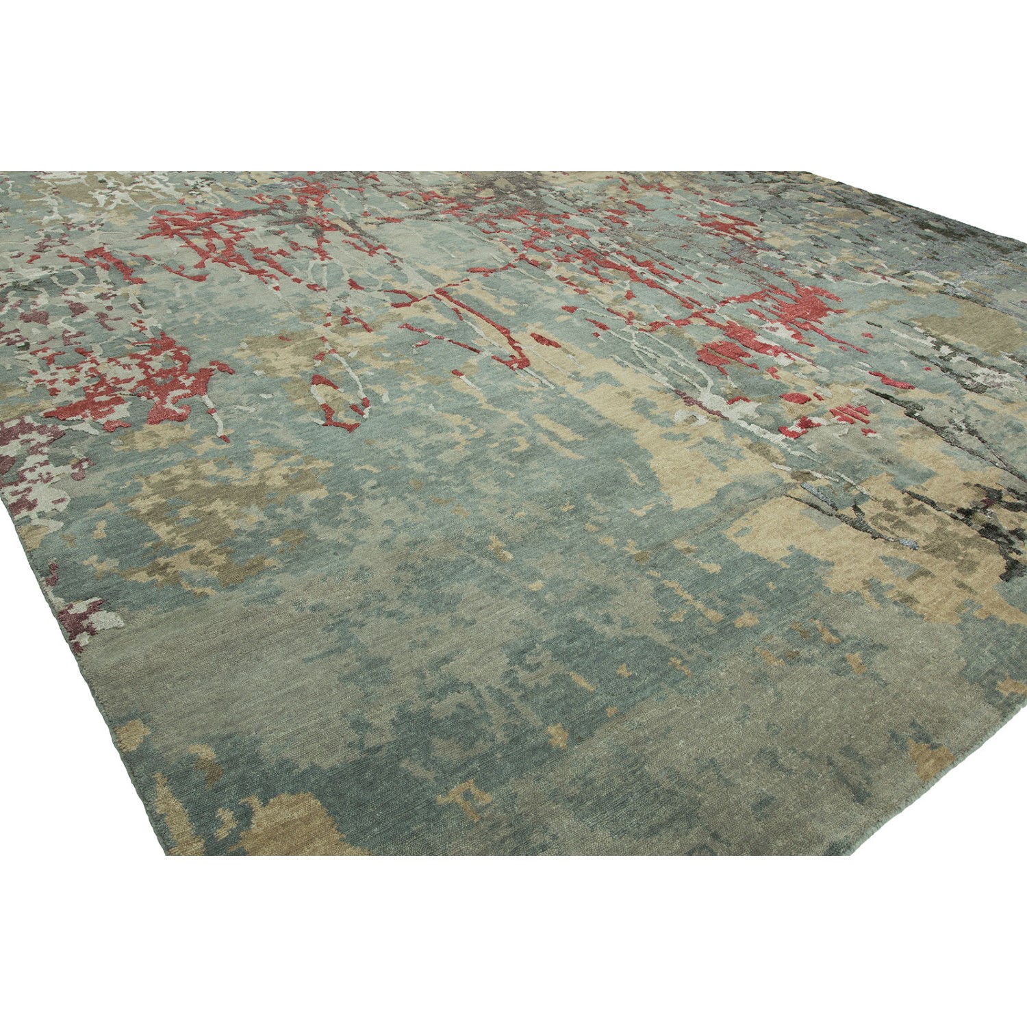 The Elegia rug is contemporary with variegated tones of red, grey, and blue. Elegia is knotted by hand in a Tibetan knot weave with with wool and Silkette, silk-like viscose yarns, against a natural cotton backing.