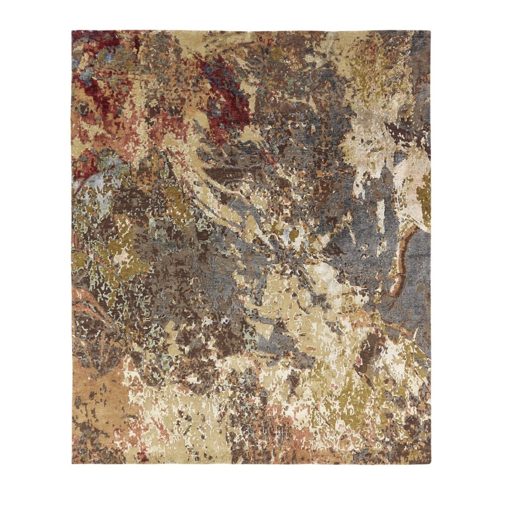 [0] => The Elegia rug is contemporary with variegated tones of taupe, red, and grey. Elegia is knotted by hand in a Tibetan knot weave with with wool and Silkette, silk-like viscose yarns, against a natural cotton backing.