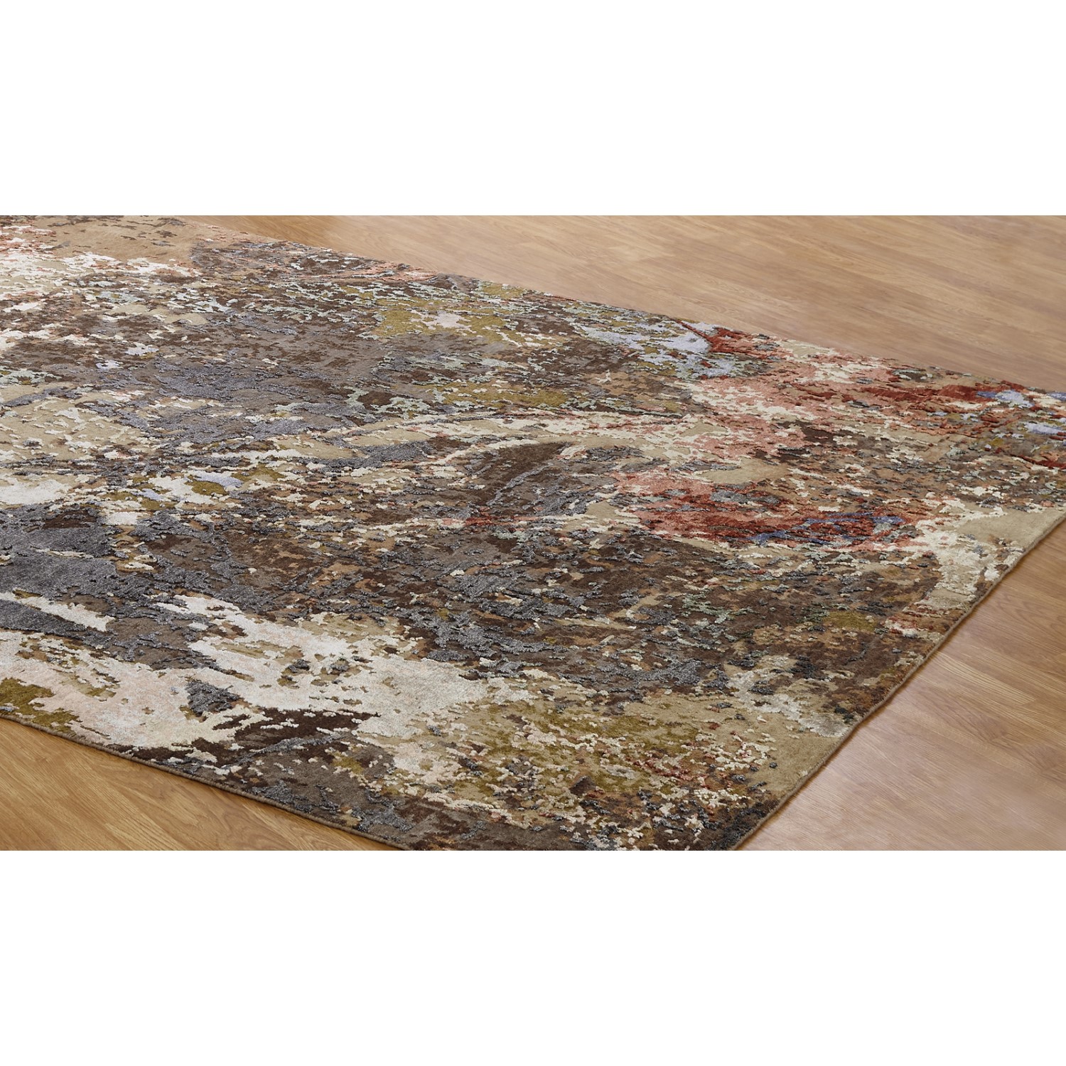 The Elegia rug is contemporary with variegated tones of taupe, red, and grey. Elegia is knotted by hand in a Tibetan knot weave with with wool and Silkette, silk-like viscose yarns, against a natural cotton backing.