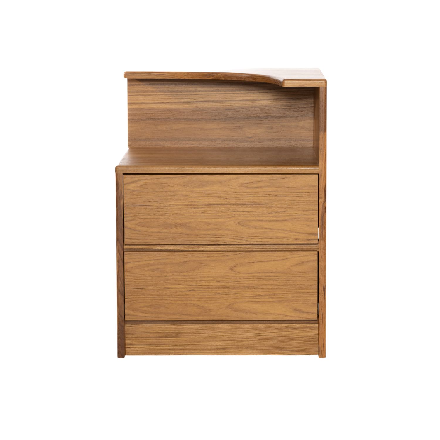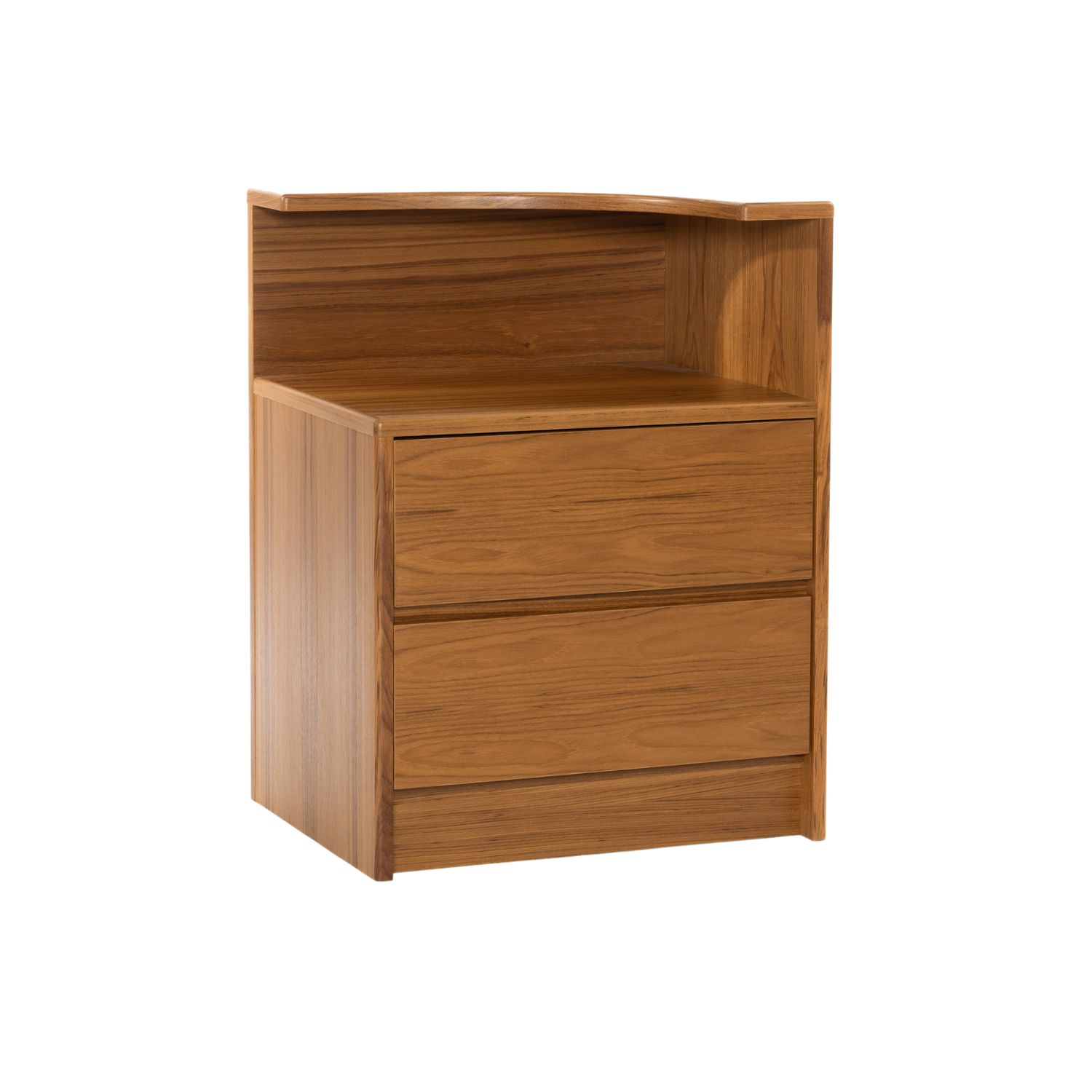 [0] => Crafted from warm teak wood, the Elena Night Table has a sleek profile full of intuitive features. A right-side shelf with a rounded cutout offers a convenient spot to place a lamp, while allowing enough room on the tabletop below for all the items you want to keep within easy reach. Made with soft-close mechanisms that prevent damage and excess noise, Elena's two drawers offer plenty of space for bedside necessities. Finally, a panel beneath the bottom drawer keeps items from getting lost beneath the nightstand so you can sleep a little easier.