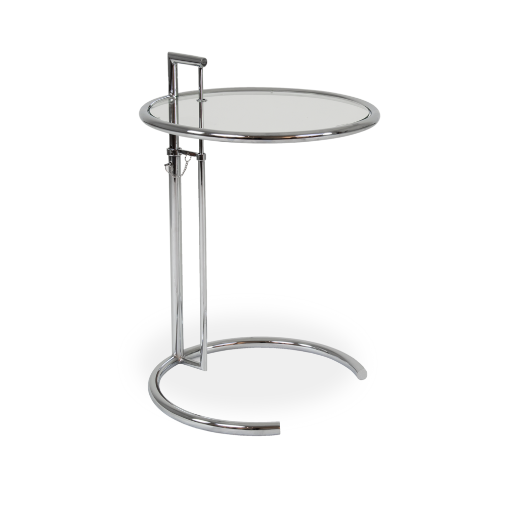 [0] => The Ellen Table features an adjustable tempered glass tabletop with a minimalist chrome support and base. The one-sided leg and open, circular design of the base allows this table to comfortably rest over the arm of a recliner or sofa, or anywhere within your seating area, while the chrome structure inspires a futuristic vibe.