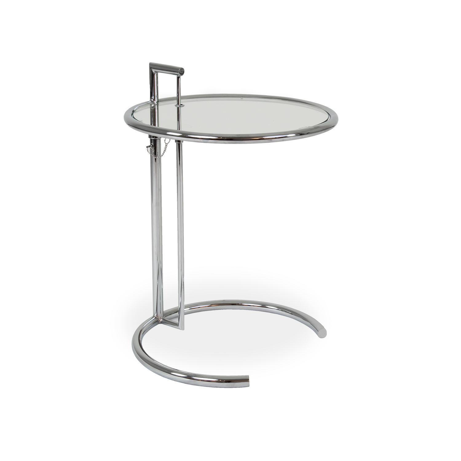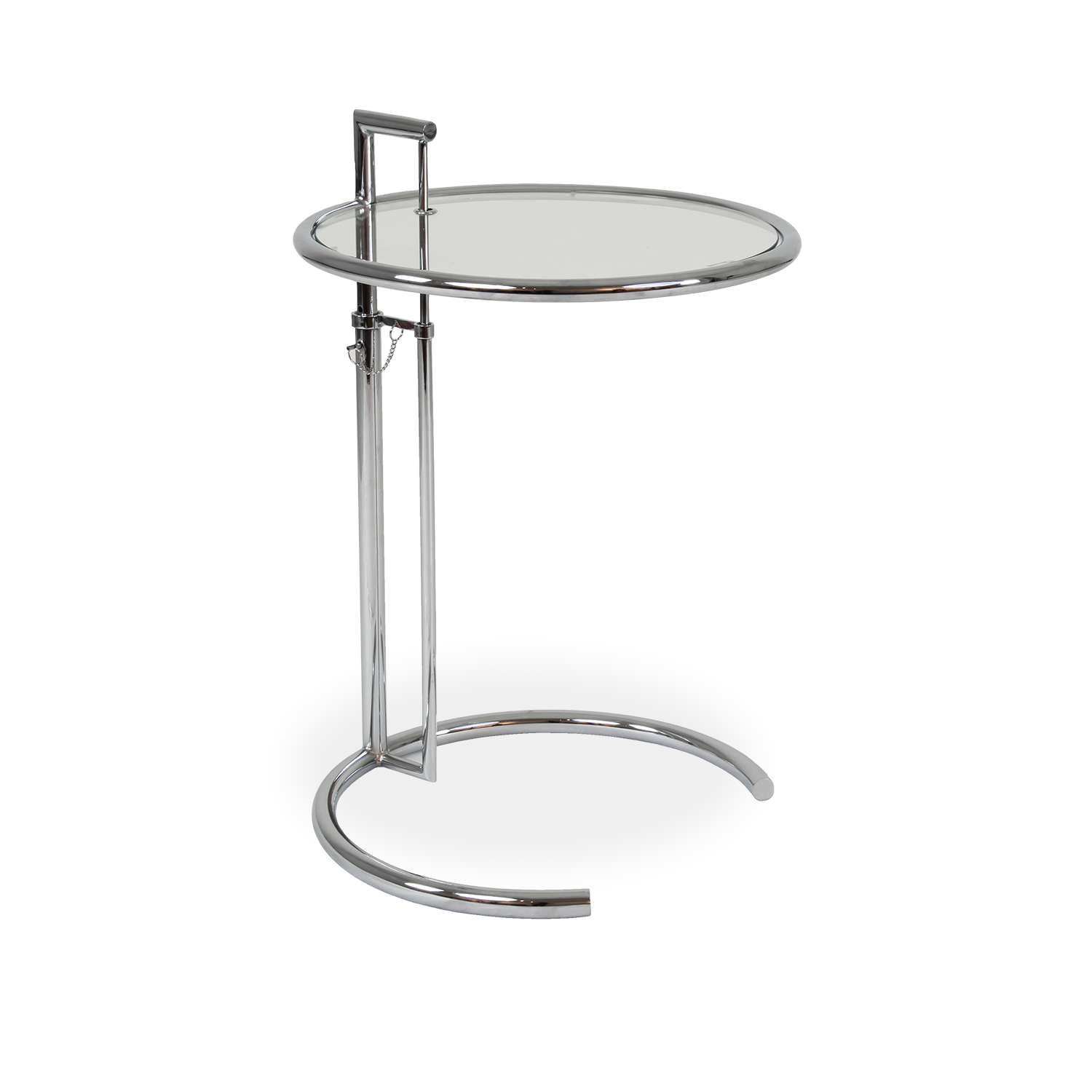 The Ellen Table features an adjustable tempered glass tabletop with a minimalist chrome support and base. The one-sided leg and open, circular design of the base allows this table to comfortably rest over the arm of a recliner or sofa, or anywhere within your seating area, while the chrome structure inspires a futuristic vibe.