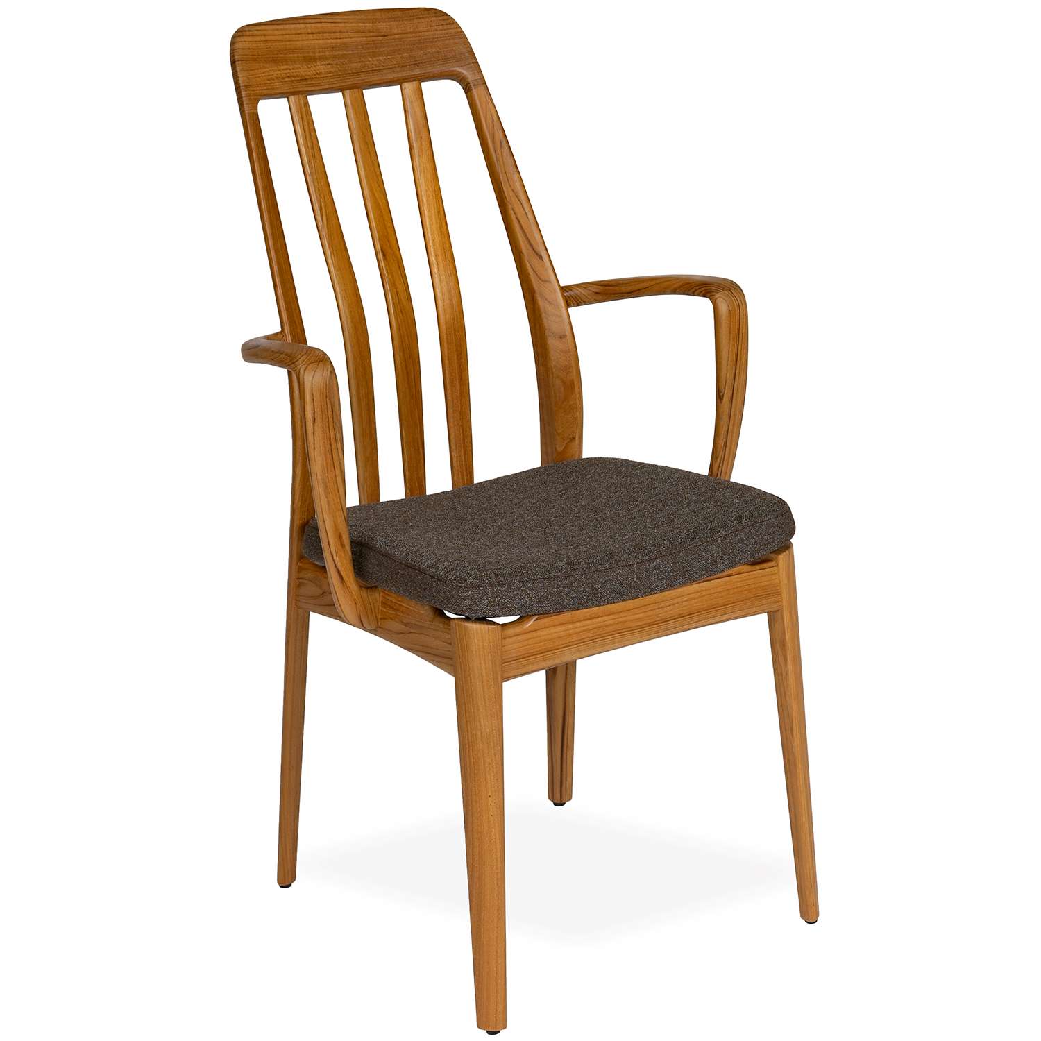 Crafted from teak wood, the Ellie Armchair embodies a lightweight, minimalist design inspired by classic Scandinavian furnishings. Ellie features clean, gently curving lines and a backrest with three vertical slats that follow the shape of your spine, maintaining your comfort through cozy breakfasts, leisurely lunches, and lively dinners. A seat cushion in brown fabric with tones of grey adds a welcoming touch to this timeless chair.