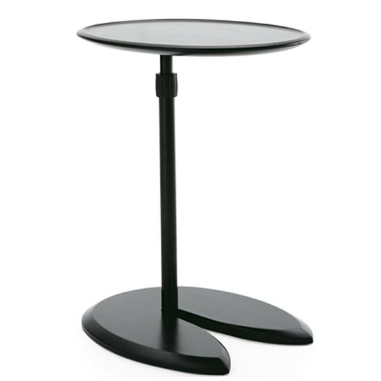 The Ellipse Table, available in black, features a height-adjustable tabletop with a slightly raised edge that matches the subtle tapering of the leaf-like base. Rounded curves add to the appealing shape of the base, giving this minimalist table an elegant flair.