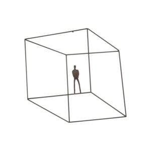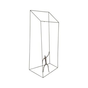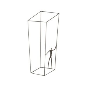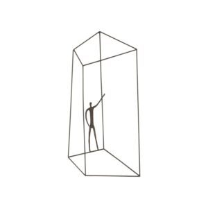 [0] => The Elongated Figure sculpture, crafted from aluminum and finished in champagne silver with bronze accents, abstractly depicts a figure balanced on one leg. The sculpture has a sense of movement and life, as the figure seems to balance and sway as it stands.