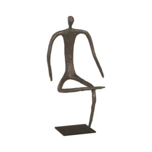 The Elongated Figure sculpture, crafted from aluminum and finished in champagne silver with bronze accents, abstractly depicts a figure balanced on one leg. The sculpture has a sense of movement and life, as the figure seems to balance and sway as it stands.