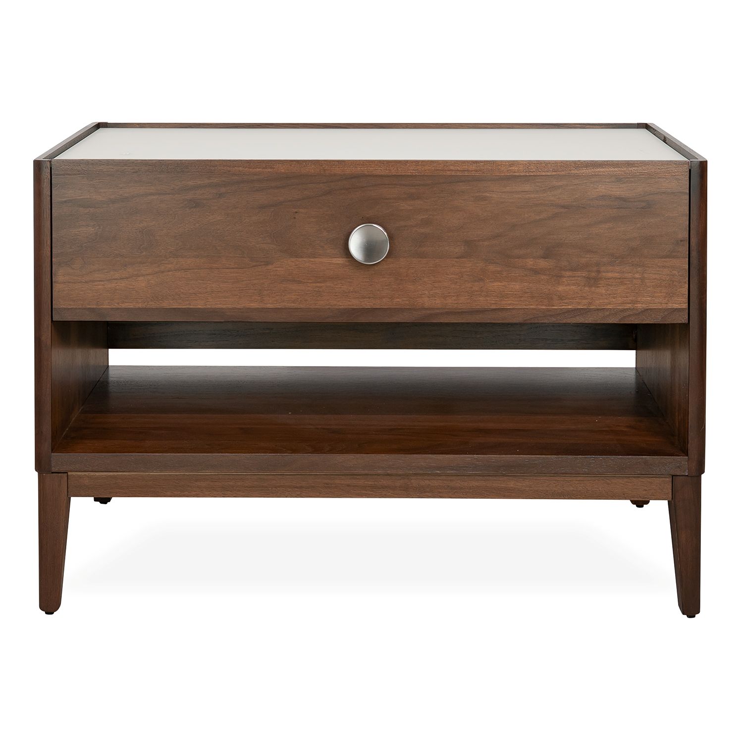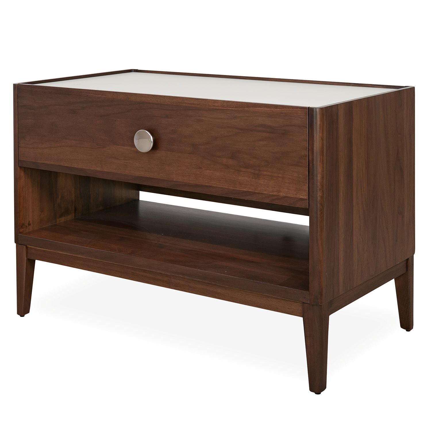 The Ema Large Right Nightstand unites classic warmth with clean, modern finishes and integrated technology. Ema's walnut frame is topped with contrasting glass in sandy off-white and accentuated with a round drawer pull in brushed nickel. The spacious soft-close drawer has an LED light within that turns on when you open it, while the open compartment below provides additional storage. An integrated wireless charger in the left side of the tabletop makes this nightstand ideal for placing on the right side of a bed to keep charging devices in easy reach. Pair Ema with the coordinating Parma Bed for casual bedroom elegance.