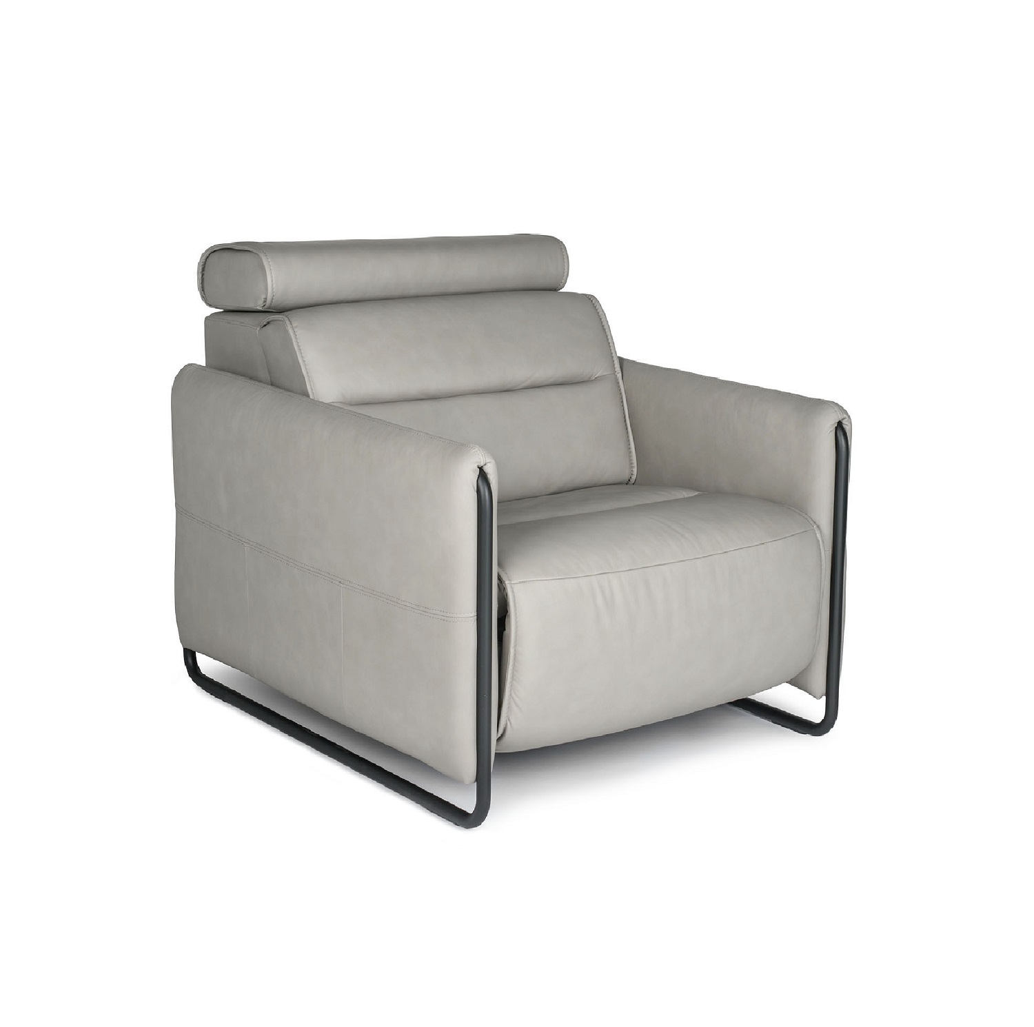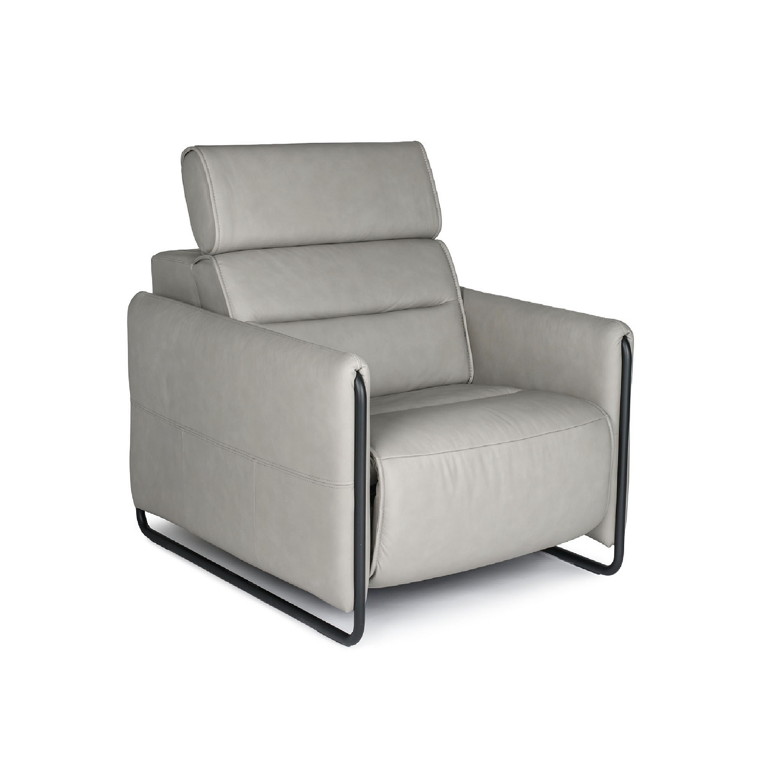 The Emily Power Chair features black steel powder-coated trim and legs, and Paloma silver grey leather upholstery. The deep, wide seat provides ample comfort, and the thin, curved arms add a minimalist touch. Matching stiching creates a tailored look, while the metal legs create a square framework within the fabric. Power controls are discretely located inside the right arm.