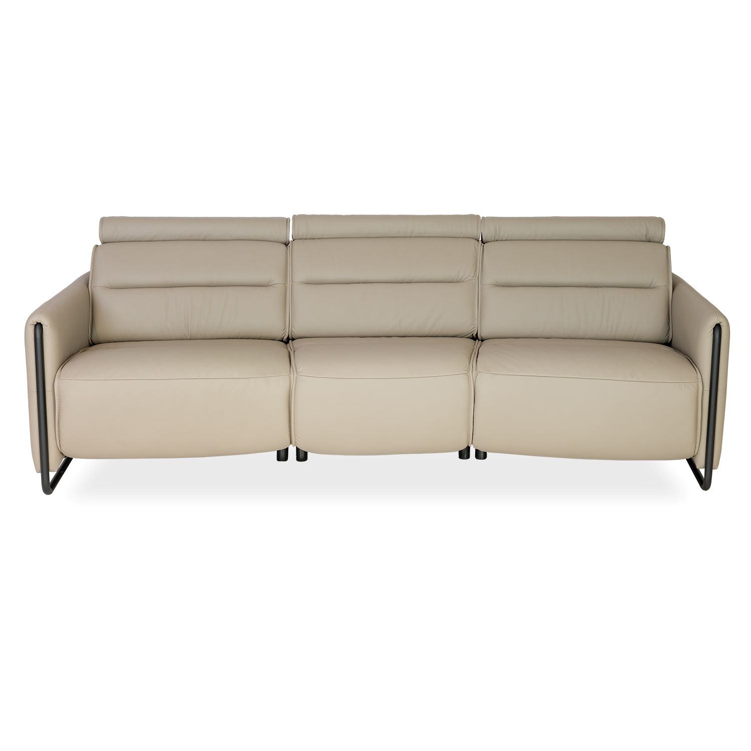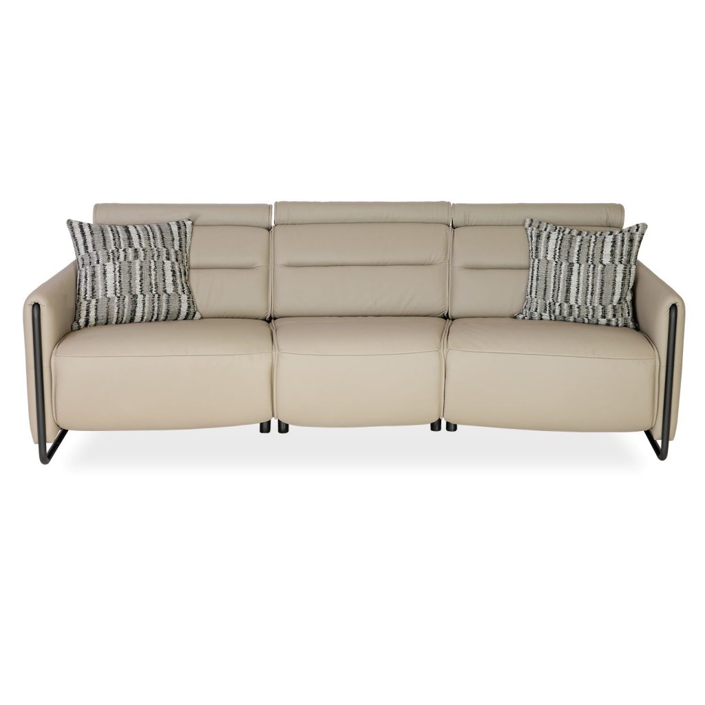 With neutral mushroom Paloma leather upholstery and black metal trim, this newest version of the Emily Sofa takes a classic design and upgrades it with features that make it more relaxing than ever. Emily's gently angled form facilitates conversation, while the improved seat cushions are made with curved springs and denser foam for greater comfort, flexibility, and resistance to stretching. The two end seats are equipped with discreet power motion buttons on the side of each cushion, connected to a single power supply and battery for ease of use. Matching stitching creates a tailored look, and the thin, curved arms supported by metal legs add a minimalist touch. Whether you're hosting a party or having a quiet night in, the Emily Sofa offers supremely comfortable and elegant seating for gathering, relaxing, and making memories.