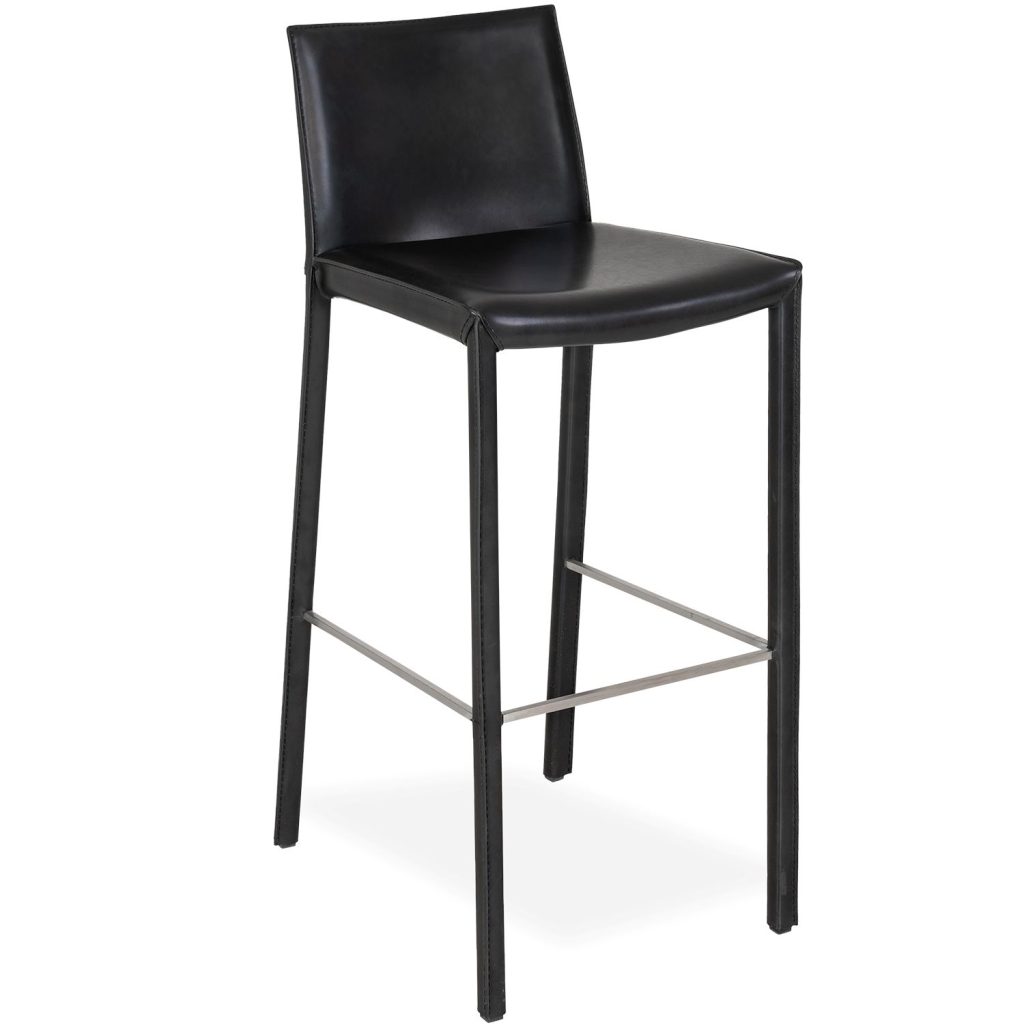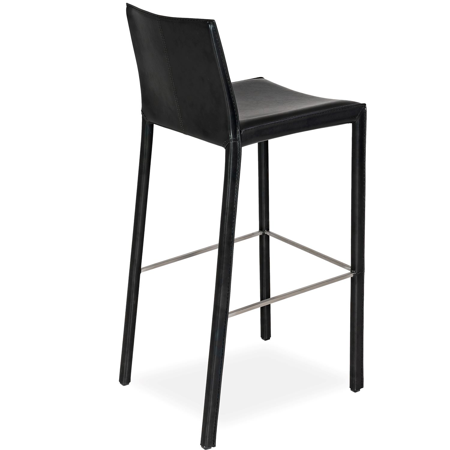 The Emma Barstool comes in sleek Ecocuoio bonded black leather that brings style to any living space. The seat, legs, and back of the barstool are fully upholstered and distinctive seams add a tailored look. Coupled with the smooth, attractive stitching on the back and the stainless steel foot rung, this stool brings a sense of structure to your bar-height table or countertop.
