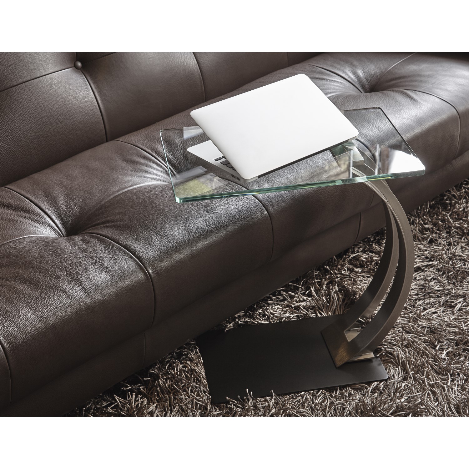 The dancing reflections on the twin arcs of the Encore Accent Table deserve a standing ovation. This dynamic and highly functional cantilevered design is perfect as a stylish side table or even a laptop caddy. Encore's dramatic champagne-plated steel legs support a solid stainless steel rectangle that is permanently bonded to the 1/2" thick clear tempered glass top. The solid steel base has a low profile that easily fits under sofas and chairs.
