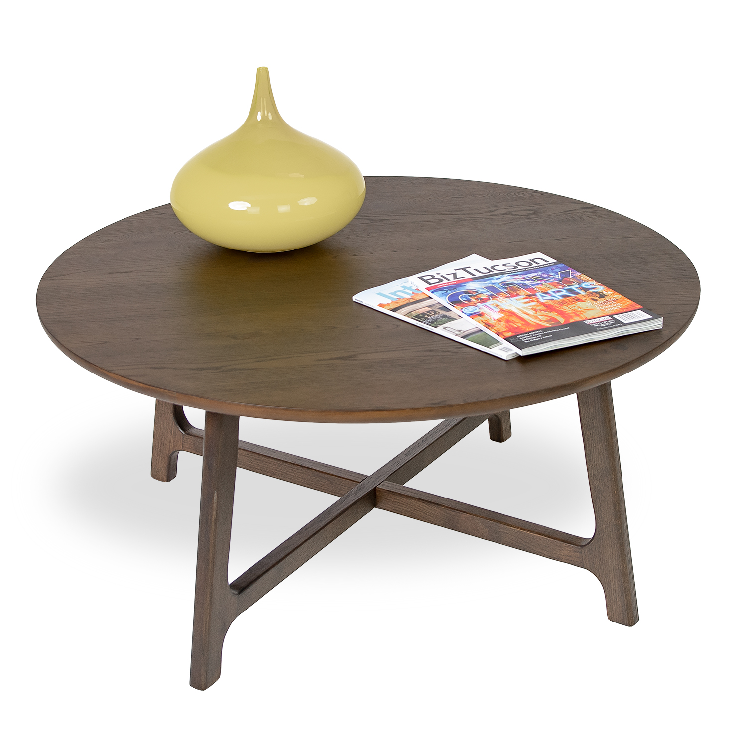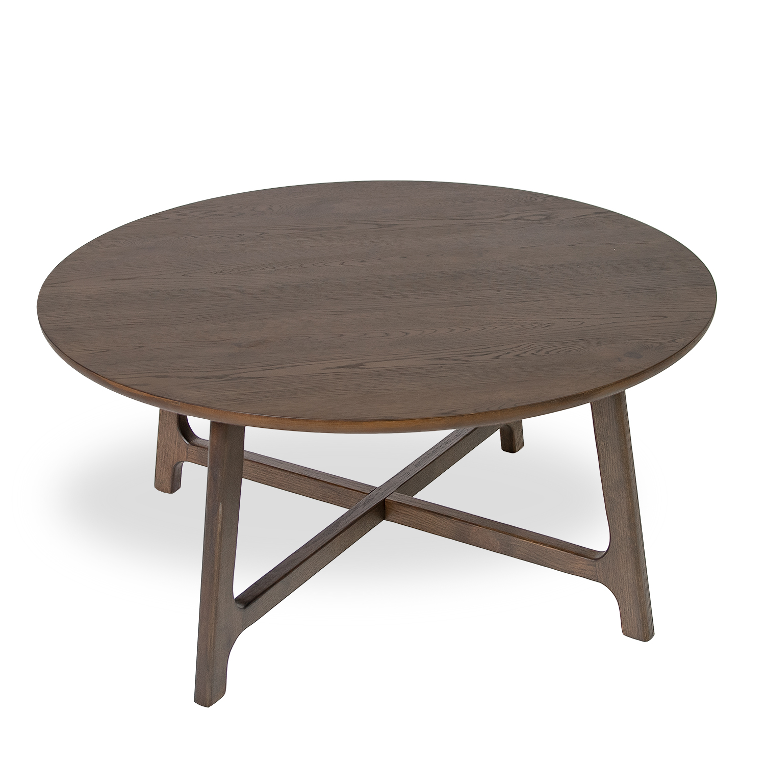 [0] => Bring a classic look and enduring style to your living room with the Enigma Round Coffee Table. Made with a brown oak finish, Enigma features a smooth circular tabletop and a masterfully crafted trestle-style base with X-shaped beams that create a bold look. With a more modest circumference of 35", the Enigma Round Coffee Table is ideal for smaller spaces and cozier gatherings.