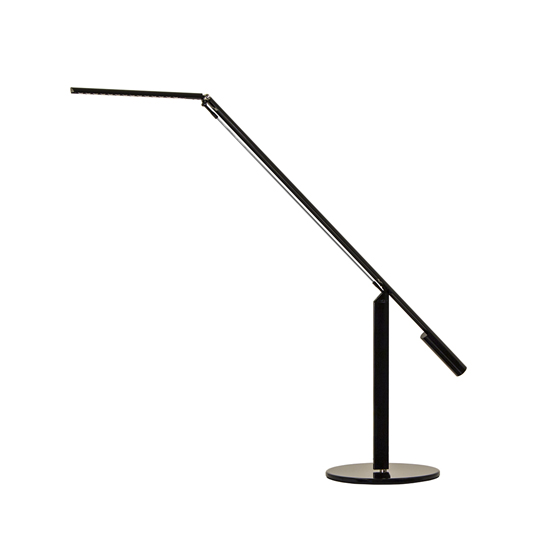 The Equo Desk Lamp, shown in black, features a discreet counterweight design for feather-light adjustability. One finger is all you need to adjust the floating arm's position. The special neck joint maintains the head's tilt as the arm swings up or down. Slide your finger along the stem's touchstrip to control brightness and power. The luminaire head is rotatable 180 degrees and is detachable for easy replacement. Compatible with optional occupancy sensor.