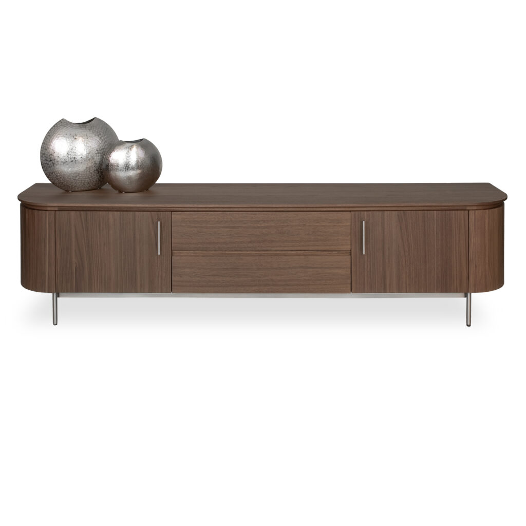 Bring mid-century modern style to your living room with the Essex TV Unit. Available in a walnut finish, this TV table has two side cabinets and two soft-close drawers to store movies, games, and other entertainment essentials. The Essex TV Unit stands on brushed stainless steel legs and features eye-catching slatted detailing reminiscent of tambour doors on its rounded sides.