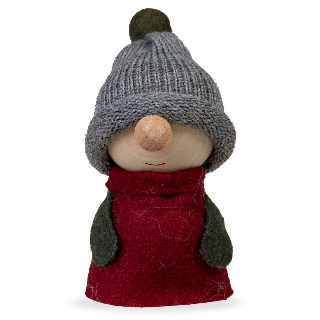 Handcrafted in Sweden, the Estrid Tomte is outfitted in a red dress and a grey knit hat with a pompom, making the perfect decorative accent for the holidays. With a wooden body and wool felt clothing, Estrid has a subtle red smile and a small nose peeking out from under her hat to give her a cozy and charming personality. Place the Estrid Tomte alone or in a grouping of other tomtes to imbue your space with a fun and festive mood. A tomte, also known as a "nisse" in Denmark and Norway, is a domestic spirit who helps to ensure the protection and well-being of the household.