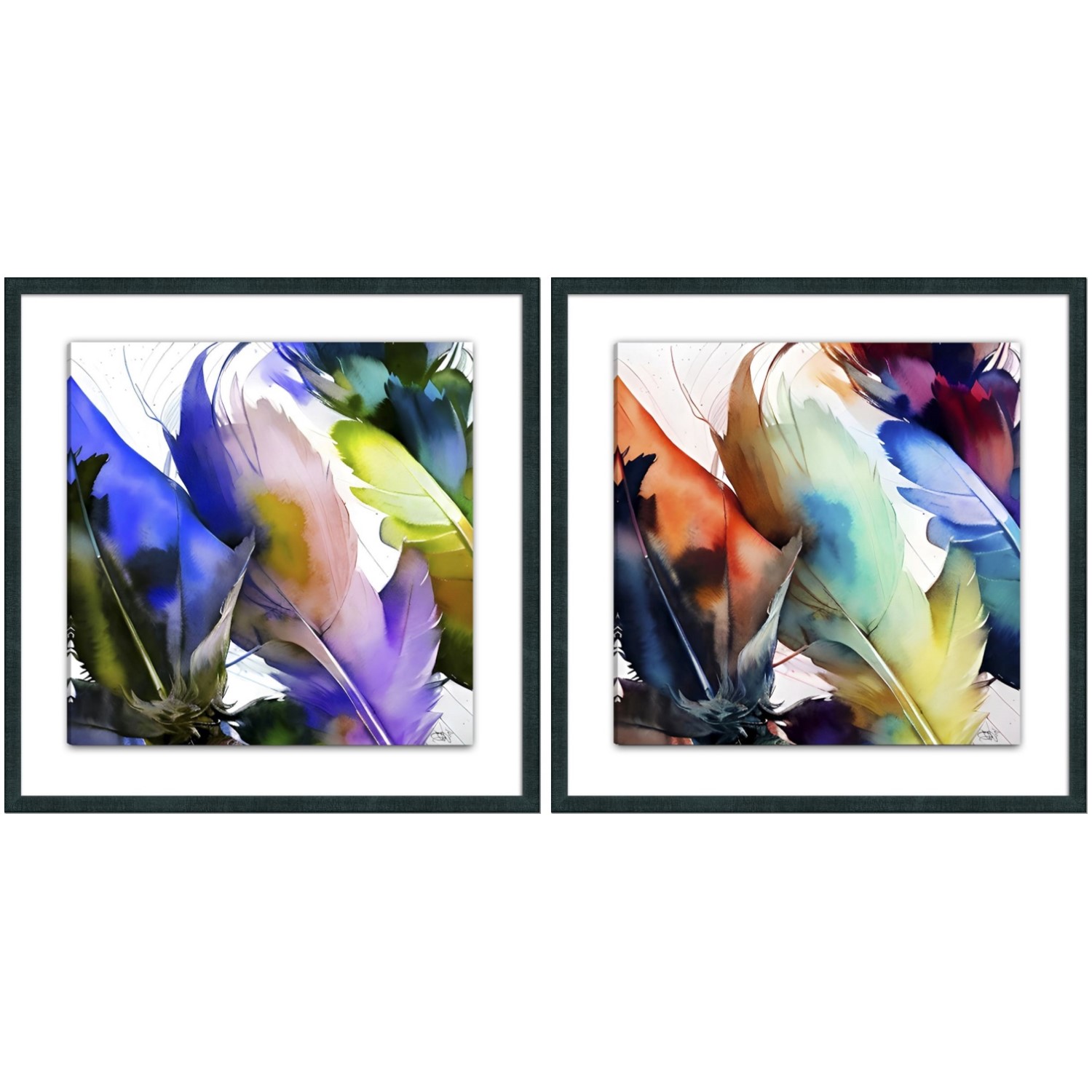 [0] => The Euphoria I & II Wall Art Set, included in shadowboxes with black frames, depicts two close-up views of colorful feathers against white backgrounds. These paintings feature jewel-toned shades of blue, green, purple, pink, orange, and brown that feel both vibrant yet delicate. Loose brushstrokes and a fluid interplay of colors give Euphoria I & II a free-spirited vibe that will add a breath of fresh air to any interior.