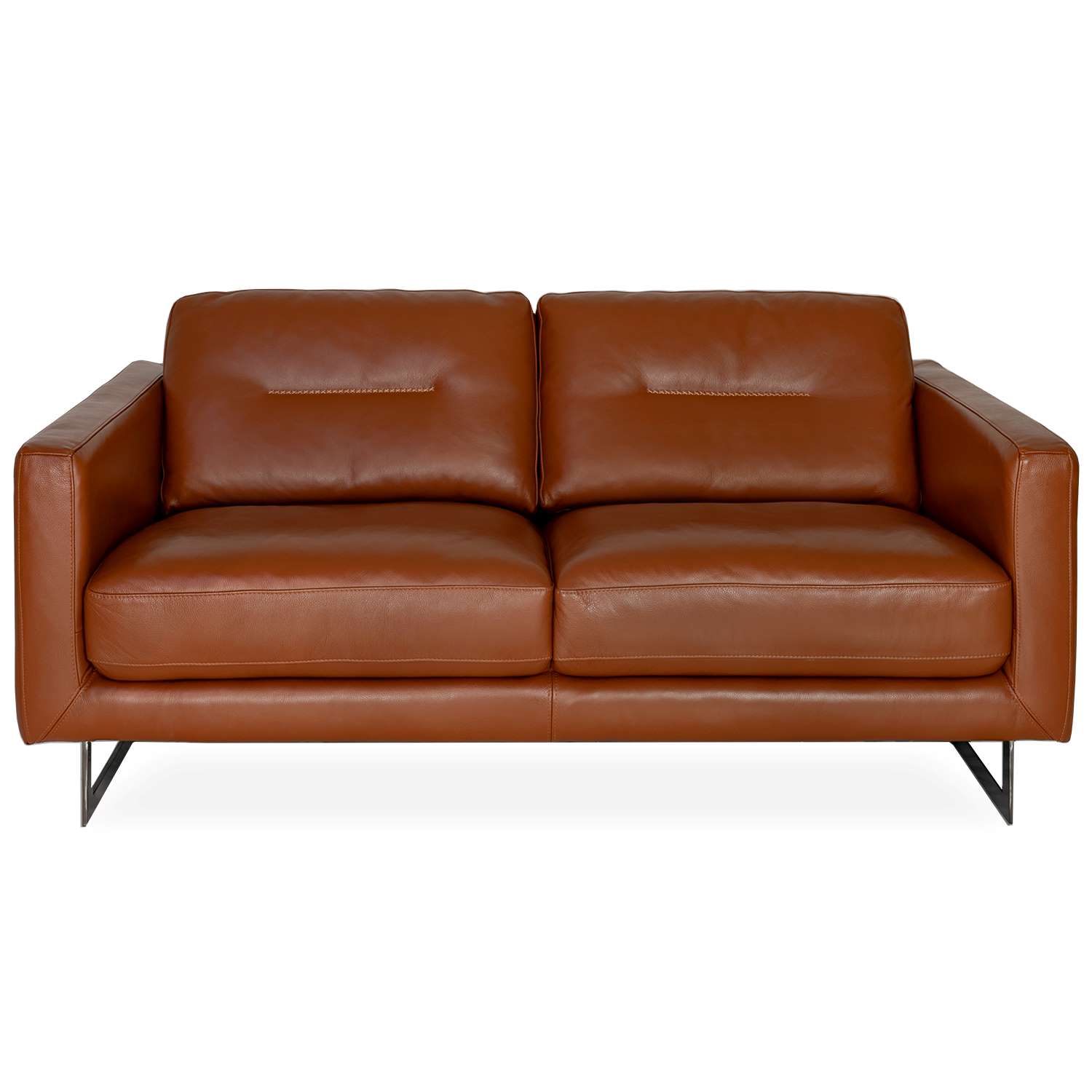 The Evan Loveseat, available in warm brown leather, contrasts clean design with casual style. Wide, downy seats complement the thin armrests, and an attractive row of cross-stitches on the back cushions add a layer of detail. Angular legs complete the design, contributing to a touch of minimalist, mid-century design.