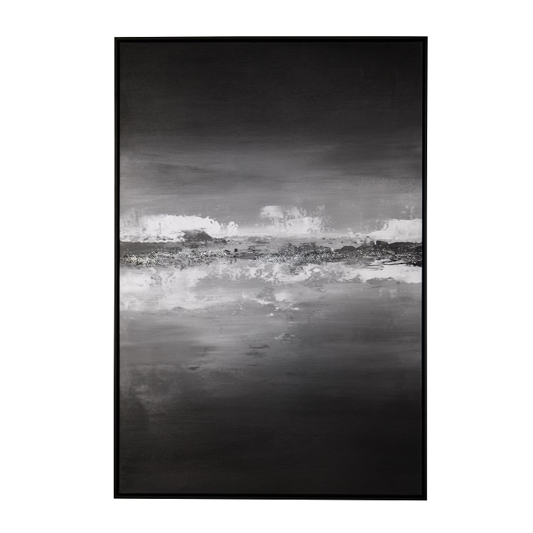 [0] => The Evening Horizon I painting, cast in black, grey, and white tones, brings a subtle yet smouldering glimmer and shine to your living space with its slight sparkle in the center of the painting. The color scheme especially enhances and complements grey, black, or white furniture.