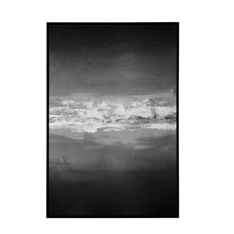 [0] => The Evening Horizon II painting, cast in black, grey, and white tones, brings a subtle yet smouldering glimmer and shine to your living space with its slight sparkle in the center of the painting. The color scheme especially enhances and complements grey, black, or white furniture.