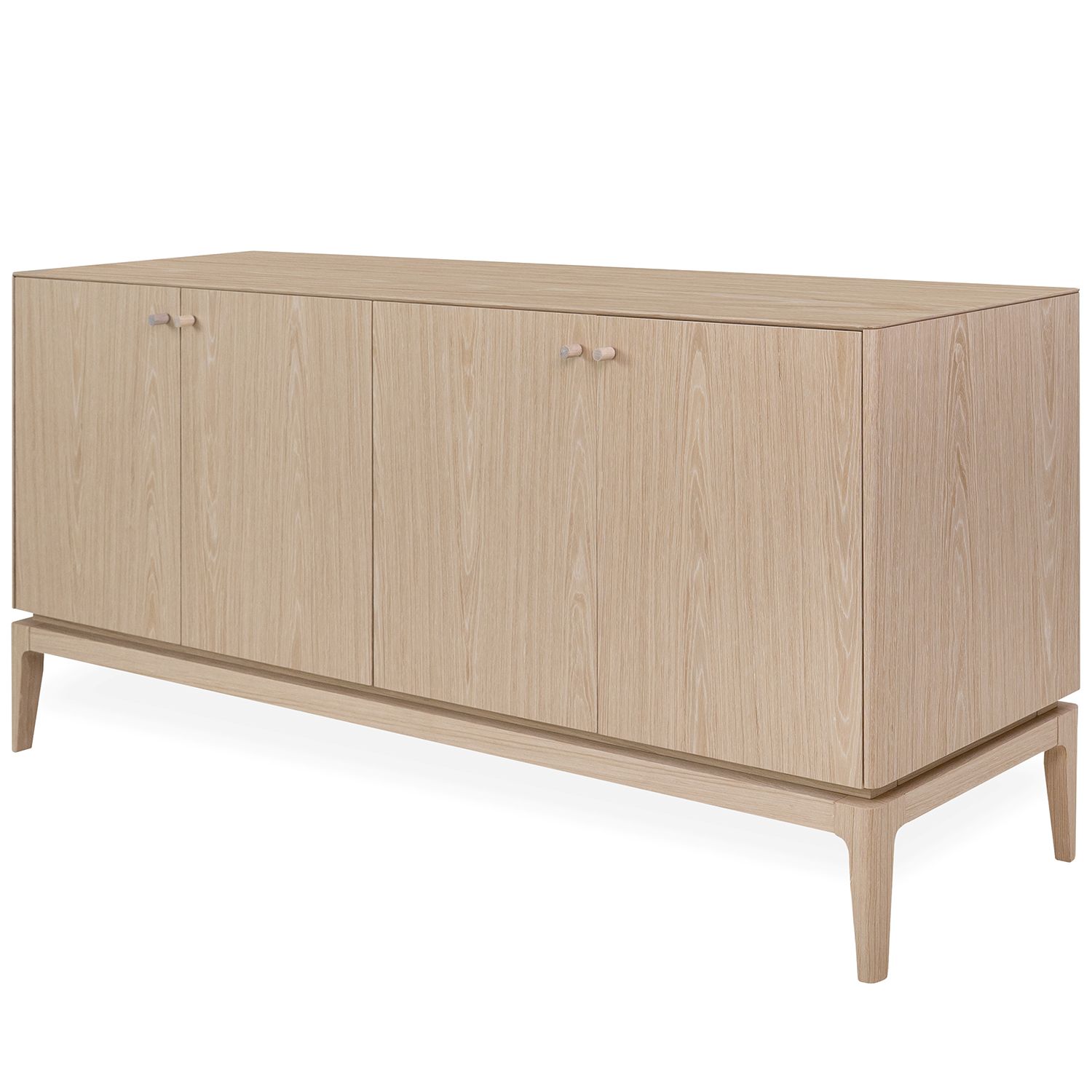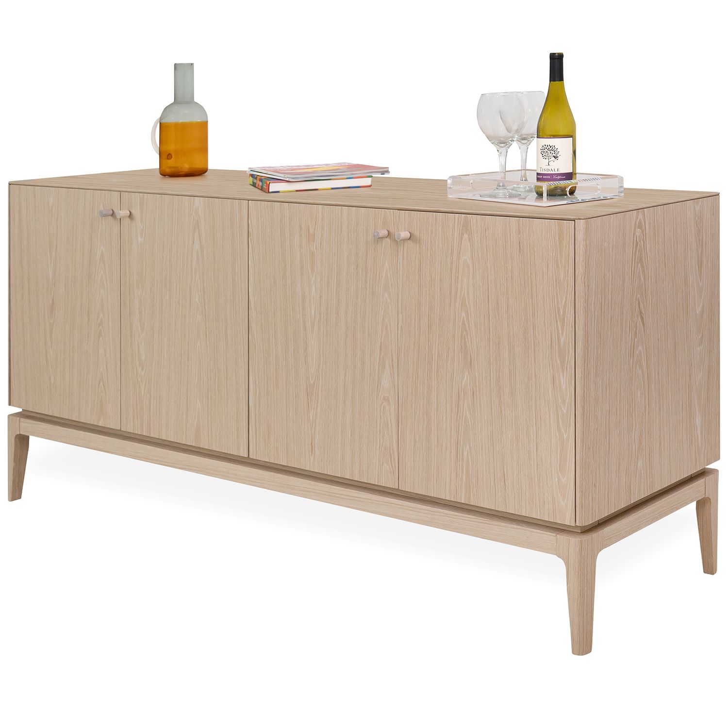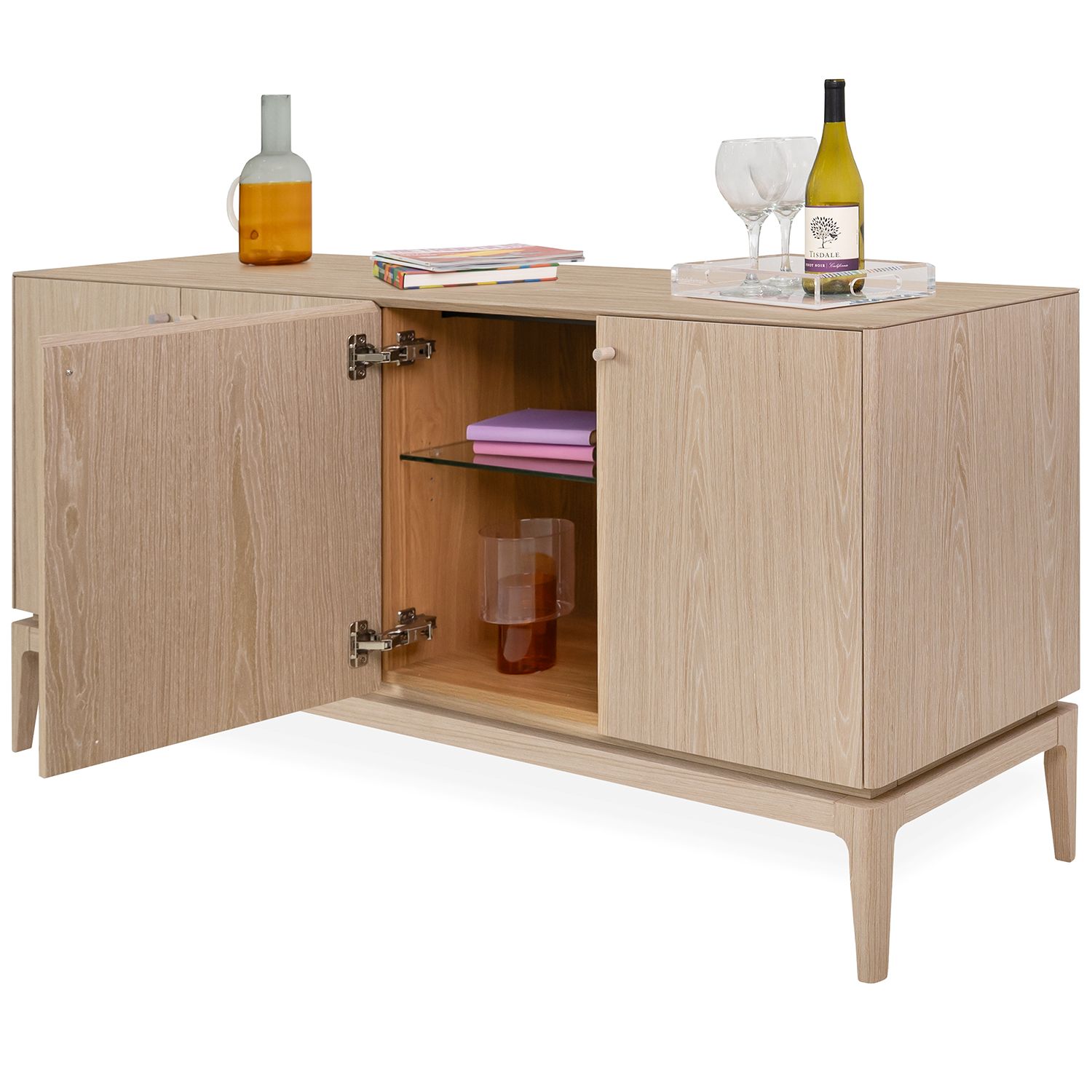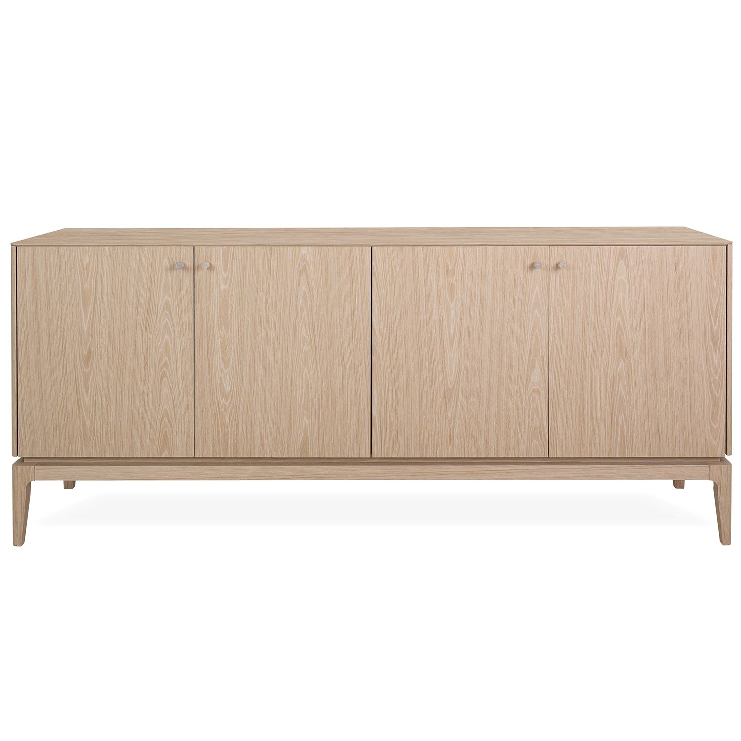 The Everett Buffet, available with a light oak veneer, seamlessly unifies clean lines into a balanced modern design. The rounded edges of the top and the slim tapering of the legs are enhanced by the elegant wood grain and simple door handles. A cutout above the base creates a neat, layered look that adds a slight edge to an otherwise classic design. Four cabinets conceal interior glass shelves which provide ample storage space for your dining essentials.