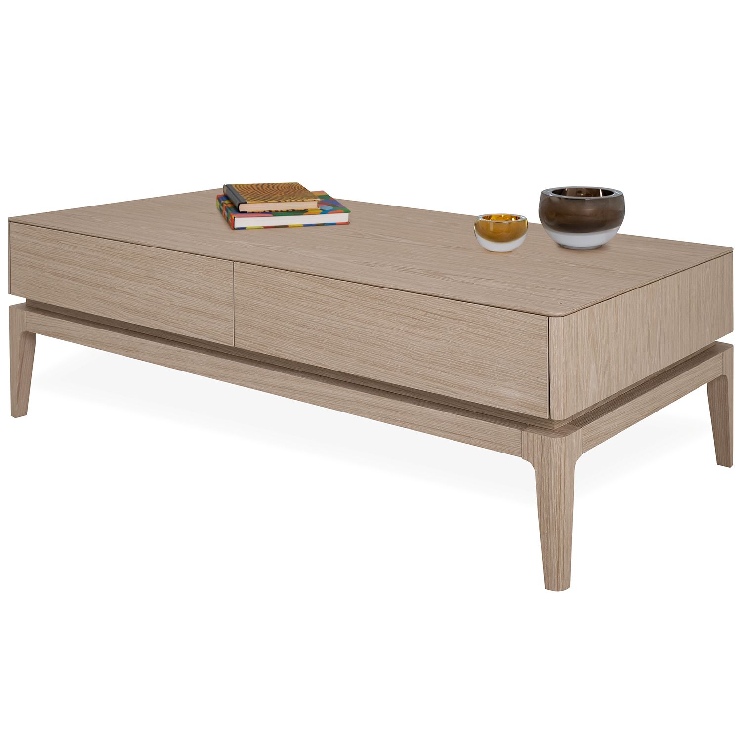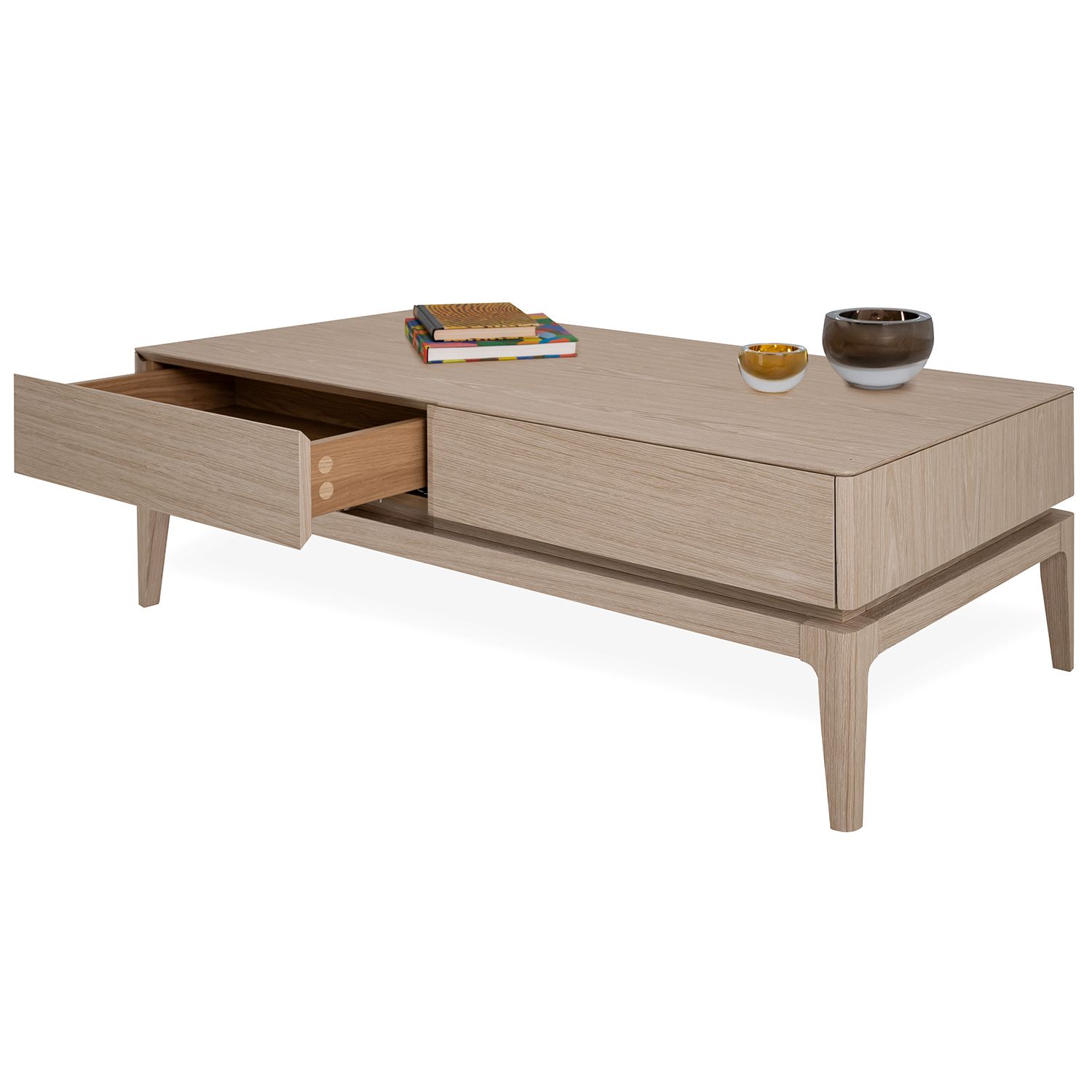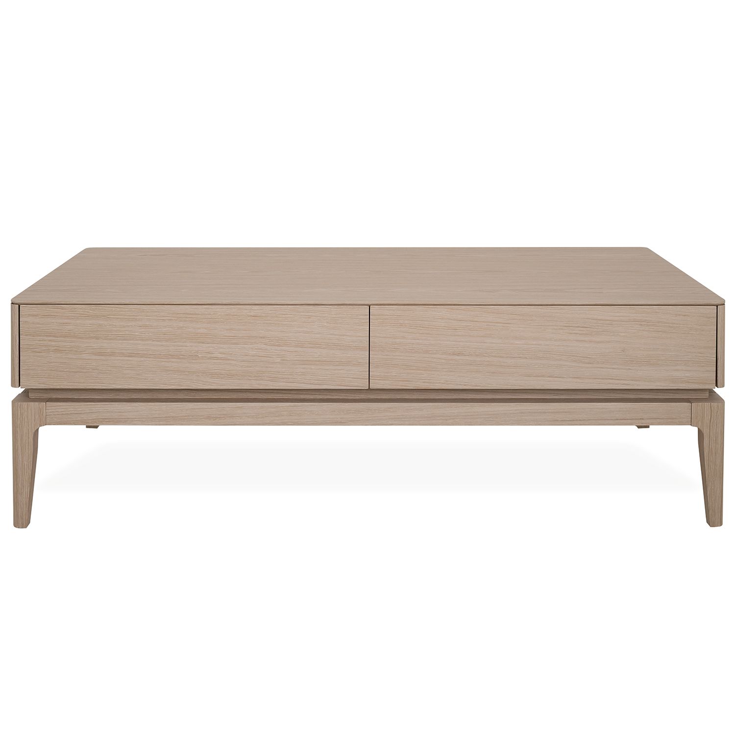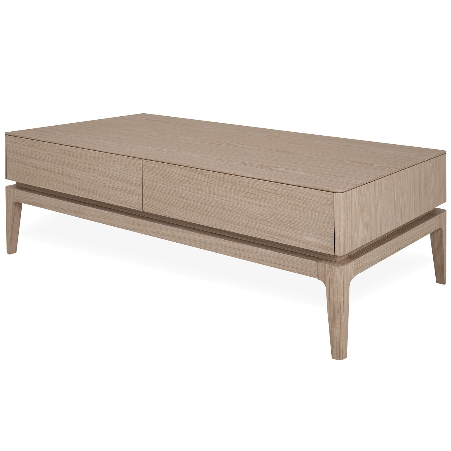 The Everett Coffee Table, available with a light oak veneer, seamlessly unifies clean lines into a balanced modern design. The rounded edges of the tabletop contrast attractively with the gradual tapering of the legs. A cutout between the tabletop and base creates a neat, layered look that adds a slight edge to an otherwise classic design. Two discreet yet spacious drawers provide room to store electronics, magazines, and more.