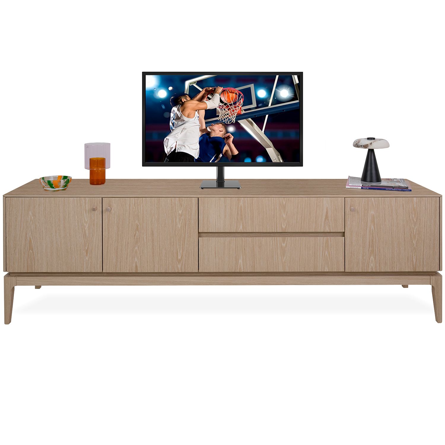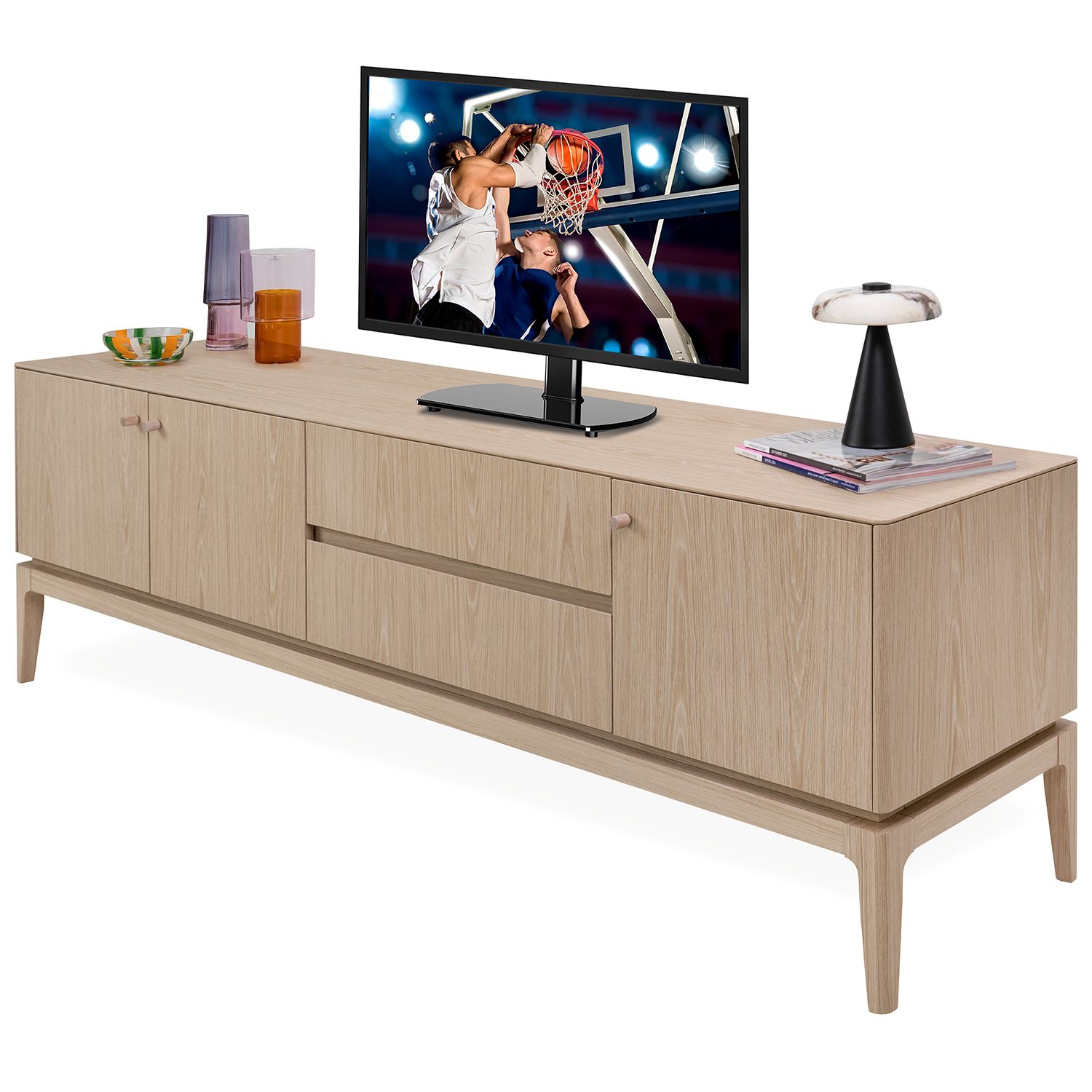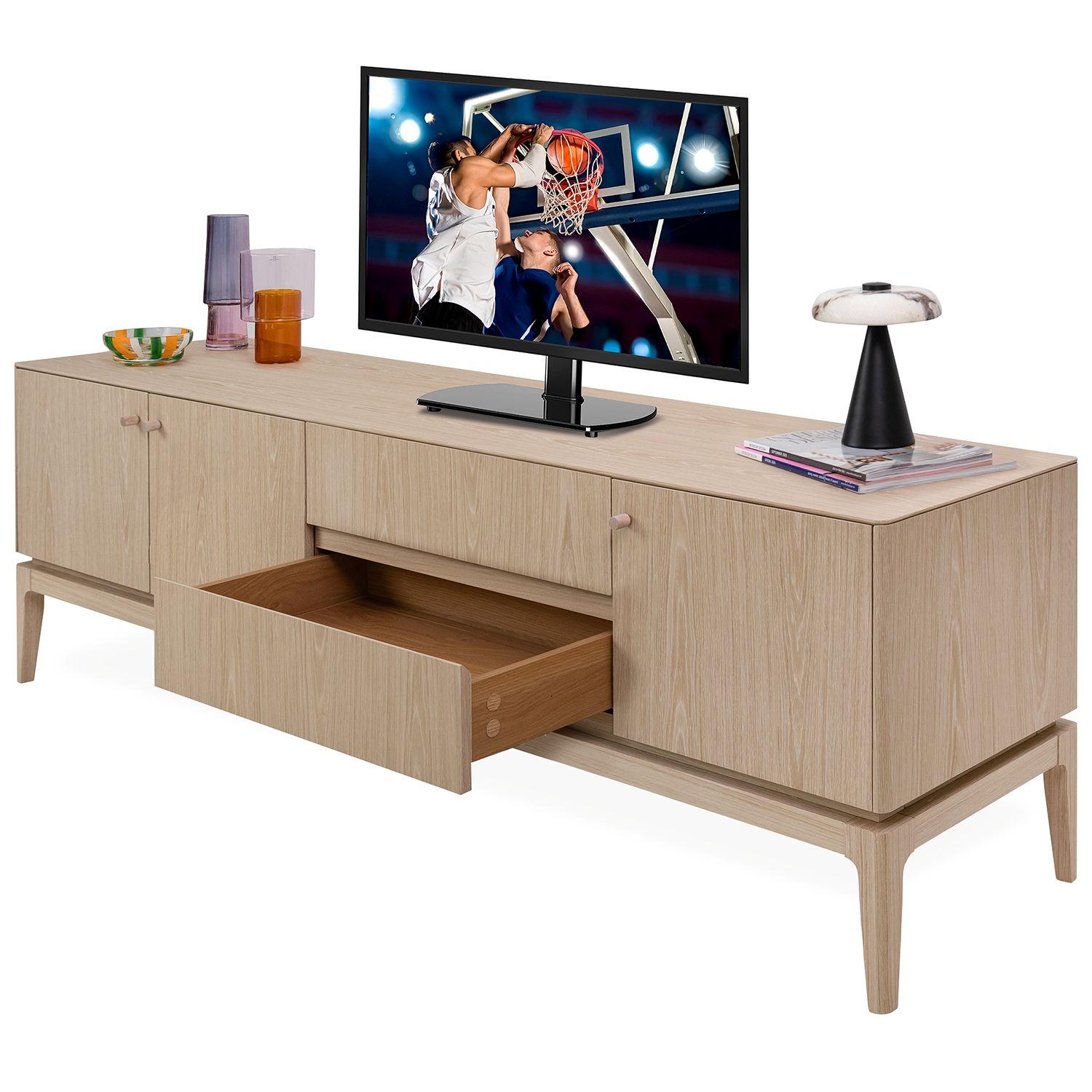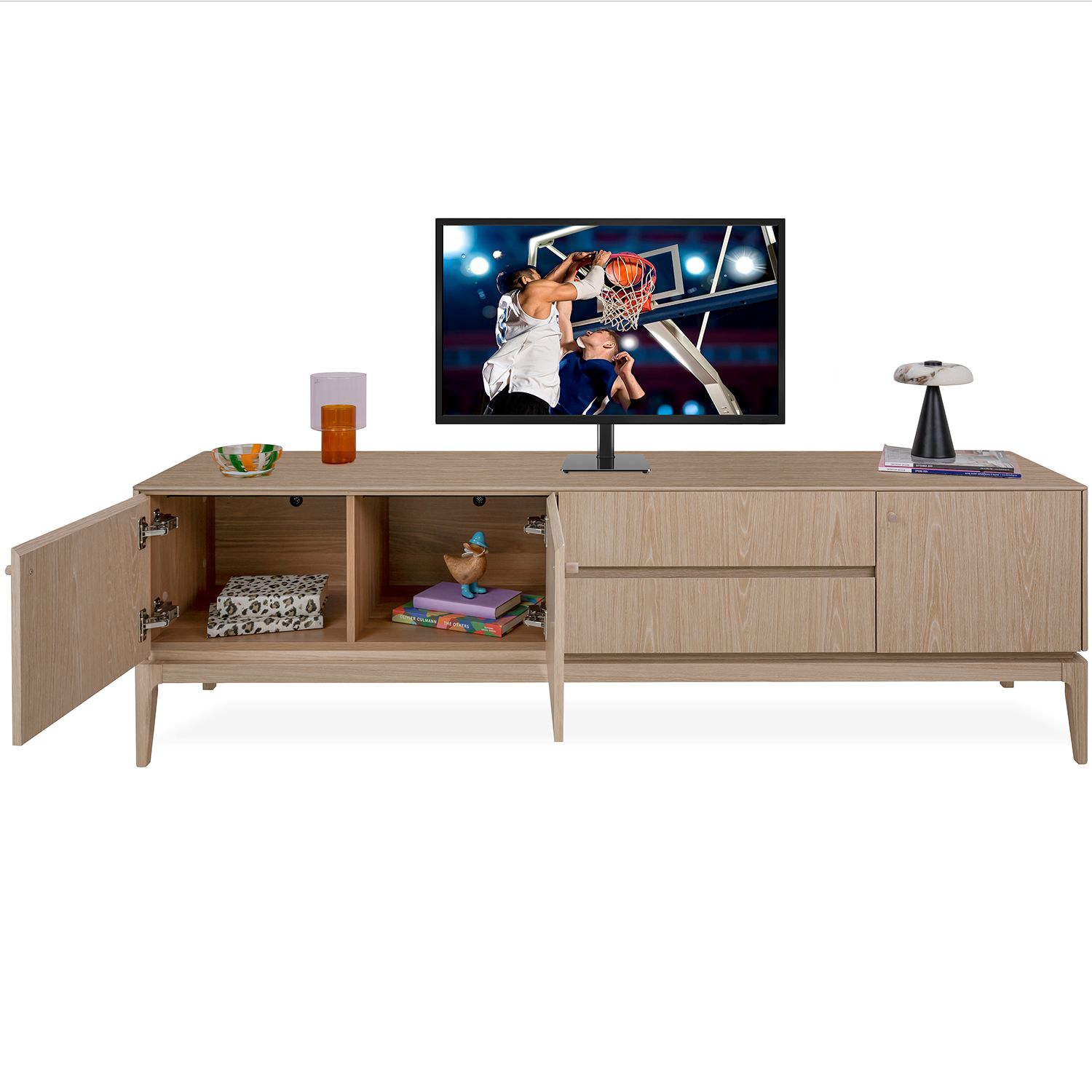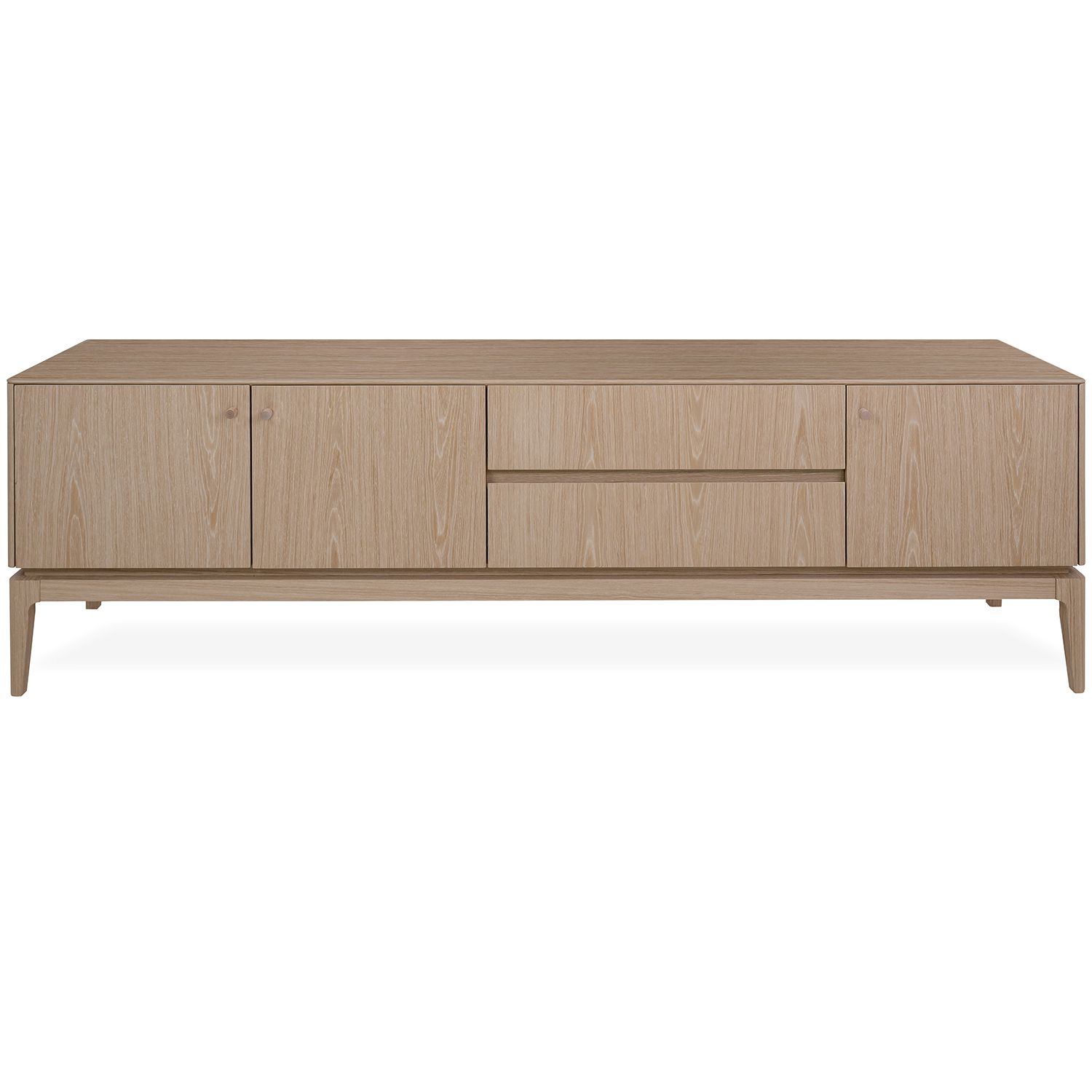 The Everett TV Stand, available with a light oak veneer, seamlessly unifies clean lines into a balanced modern design. The rounded edges of the top and the slim tapering of the legs are enhanced by the elegant wood grain and simple door handles. A cutout above the base creates a neat, layered look that adds a slight edge to an otherwise classic design. Three cabinets and two drawers provide storage space for all of your entertainment needs.