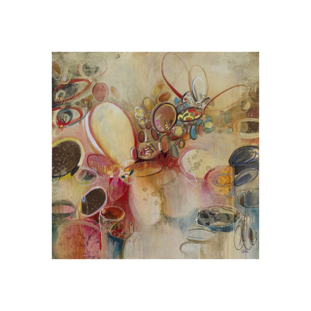 [0] => Exotic Garden II is an acrylic painting featuring whimsical shapes and a tasteful blend of bright and muted tones. Rounded forms suggestive of butterflies and flowers are rendered in red, pink, orange, blue, yellow, and brown over a beige background. This wall art captures the lively energy of a garden while being abstract enough to stir the imagination toward multiple interpretations.