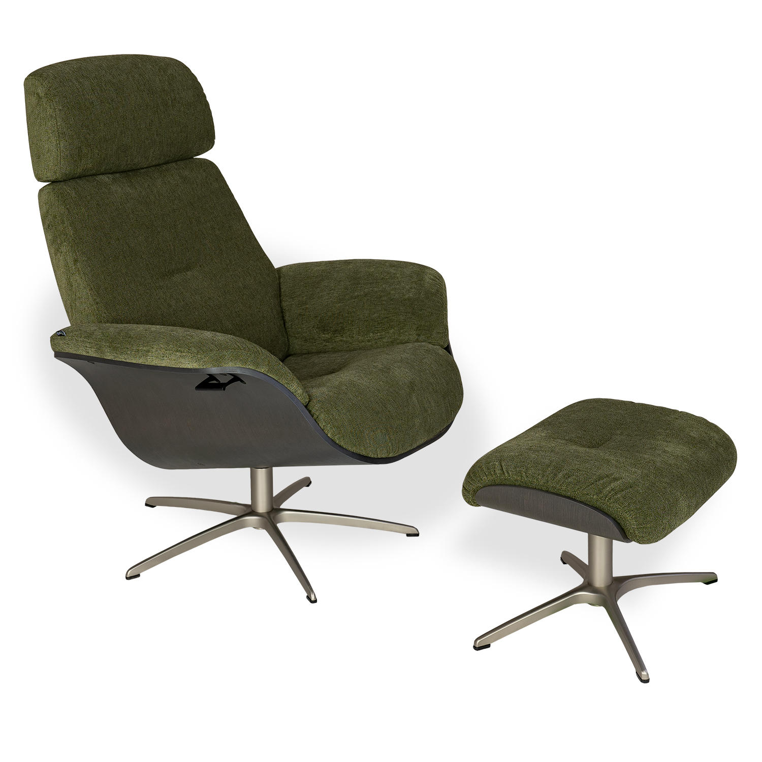 [0] => Designed in Norway, the Falcon Chair and Ottoman feature a form reminiscent of the classic Eames chair and ottoman, with rounded lines and curved wood framing for optimal style and comfort. Falcon is upholstered in forest green Safir fabric and supported by a wooden shell with a charcoal finish. The brushed steel star base is equipped with a mechanism that lets the chair swivel 360 degrees, and a lever under the right armrest allows you to recline the chair to your perfect angle. Falcon's headrest is also manually adjustable, letting you customize it to your preferred height. Both timeless and modern, the Falcon Chair and Ottoman will bring you top-tier relaxation while making an iconic statement.