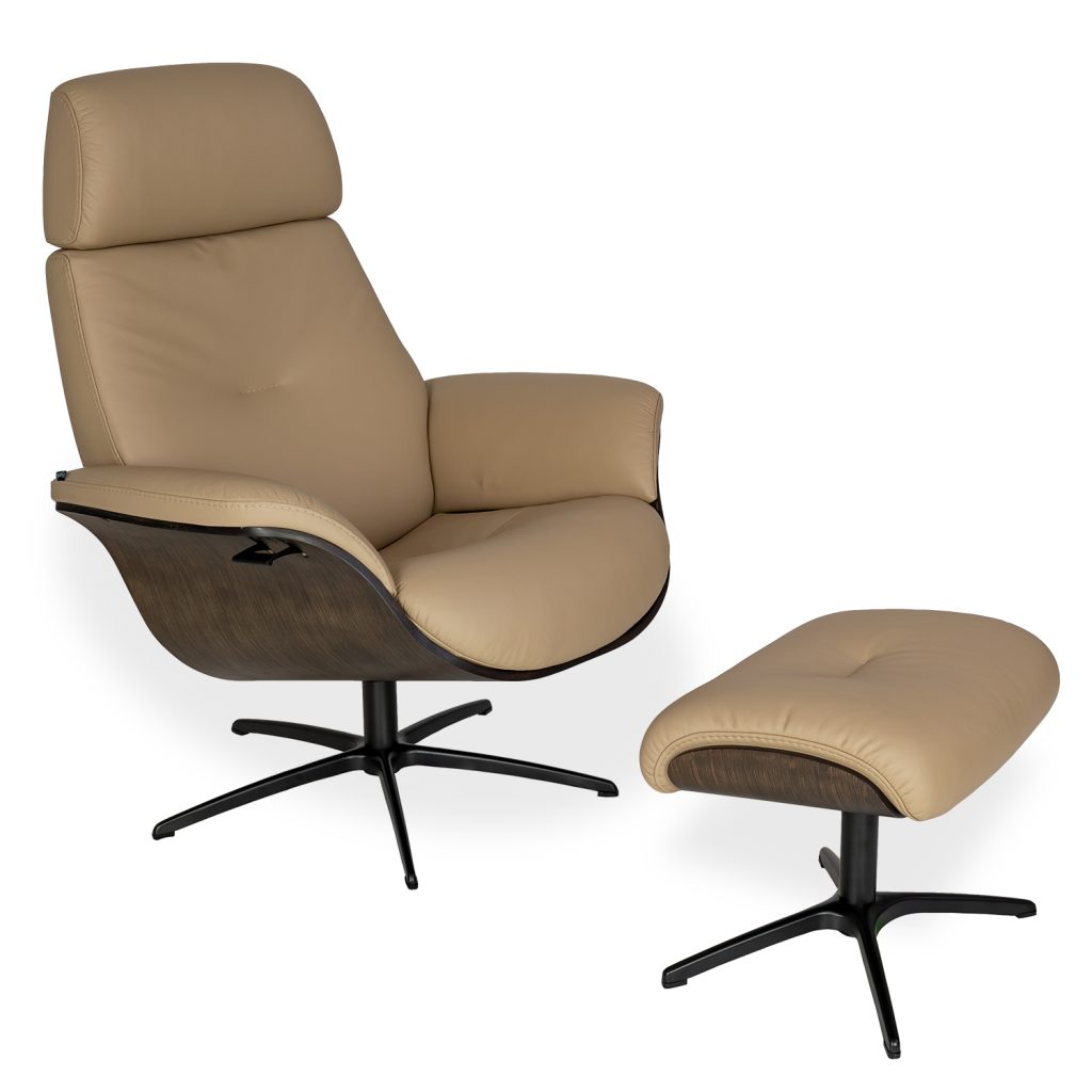 [0] => Designed in Norway, the Falcon Chair and Ottoman feature a form reminiscent of the classic Eames chair and ottoman, with rounded lines and curved wood framing for optimal style and comfort. Falcon is upholstered in latte brown leather and supported by a wooden shell with a dark brown mocha finish. The black metal star base is equipped with a mechanism that lets the chair swivel 360 degrees, and a lever under the right armrest allows you to recline the chair to your perfect angle. Falcon's headrest is also manually adjustable, letting you customize it to your preferred height. Both timeless and modern, the Falcon Chair and Ottoman will bring you top-tier relaxation while making an iconic statement.