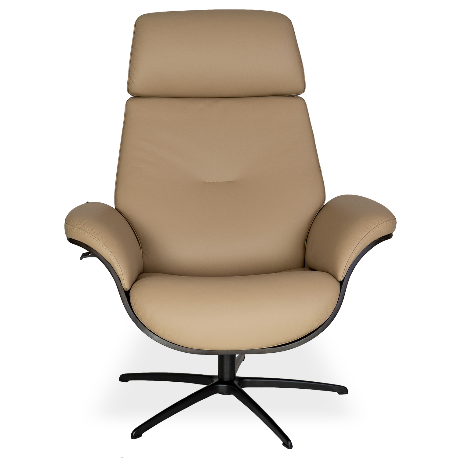 Designed in Norway, the Falcon Chair and Ottoman feature a form reminiscent of the classic Eames chair and ottoman, with rounded lines and curved wood framing for optimal style and comfort. Falcon is upholstered in latte brown leather and supported by a wooden shell with a dark brown mocha finish. The black metal star base is equipped with a mechanism that lets the chair swivel 360 degrees, and a lever under the right armrest allows you to recline the chair to your perfect angle. Falcon's headrest is also manually adjustable, letting you customize it to your preferred height. Both timeless and modern, the Falcon Chair and Ottoman will bring you top-tier relaxation while making an iconic statement.
